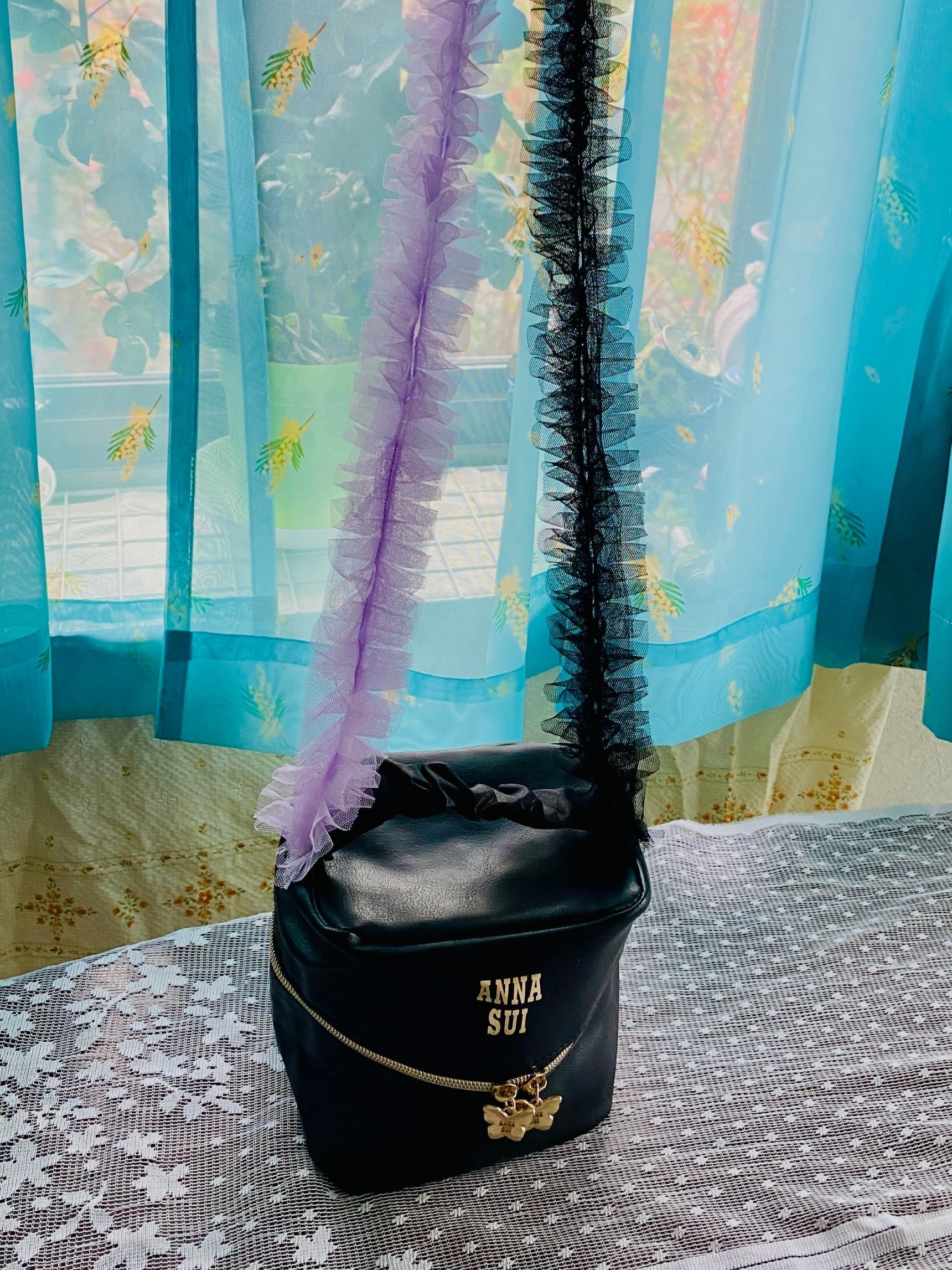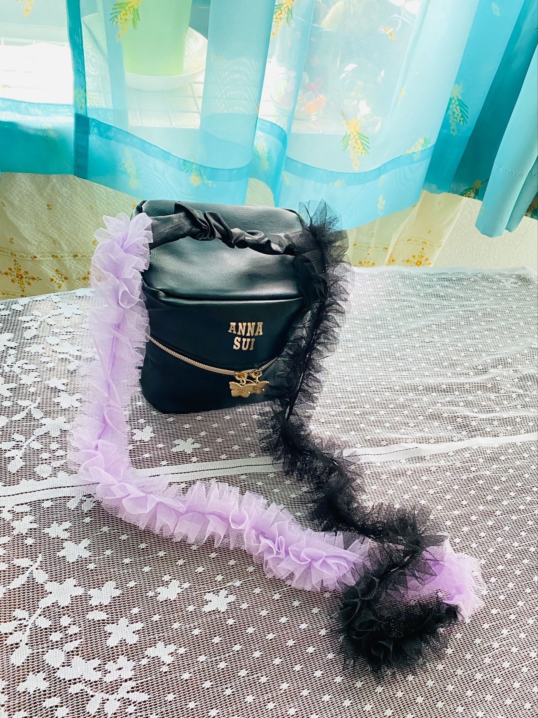 モノクロのフリルチュールテープは1個しかなかったので、アナスイのイメージカラーといえば、ブラックにパープルが定番、そこでモノトーンとパープルのツートンカラー仕立てにしてみました。