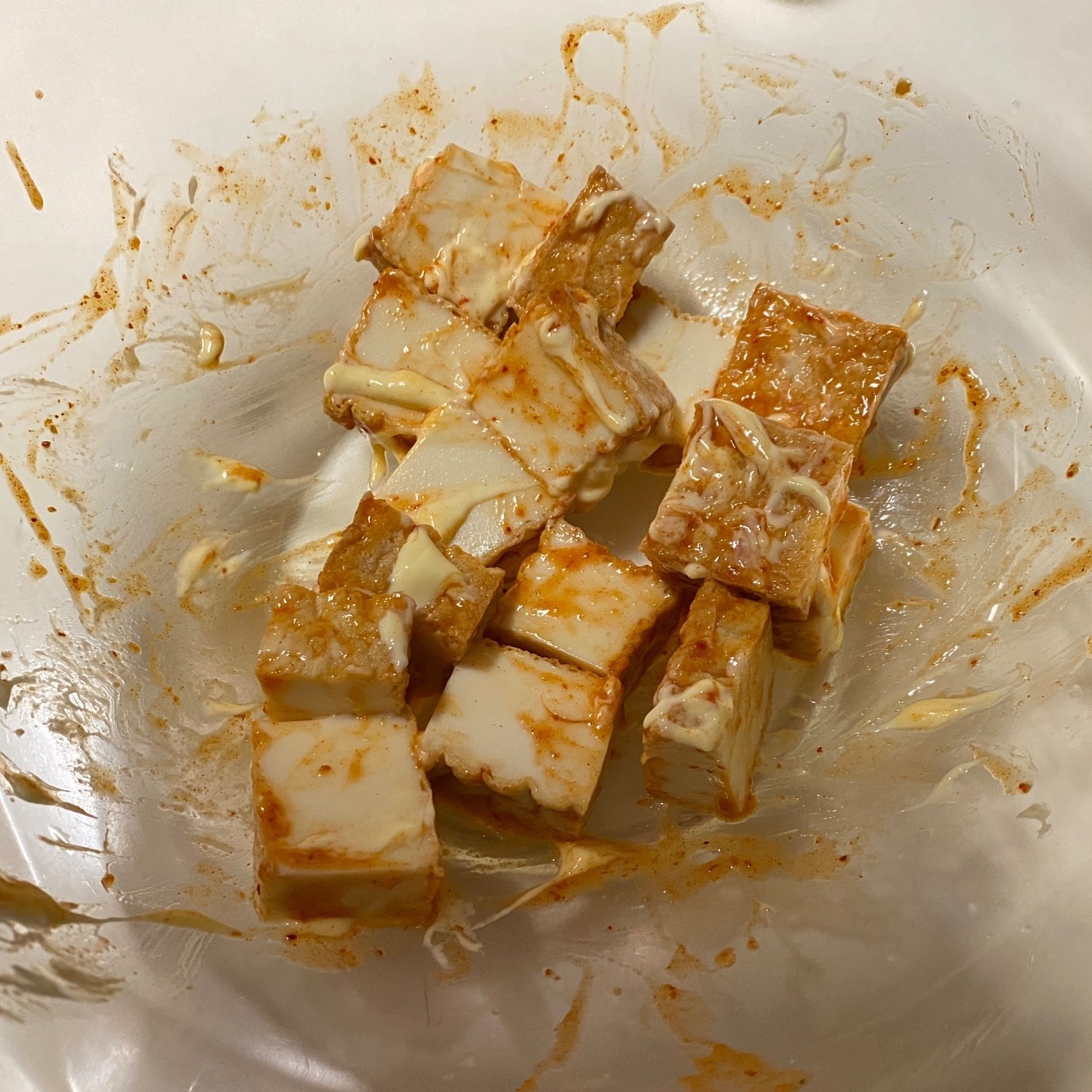 よく水気を切ります。キムチ、マヨネーズを入れてよく絡めます。