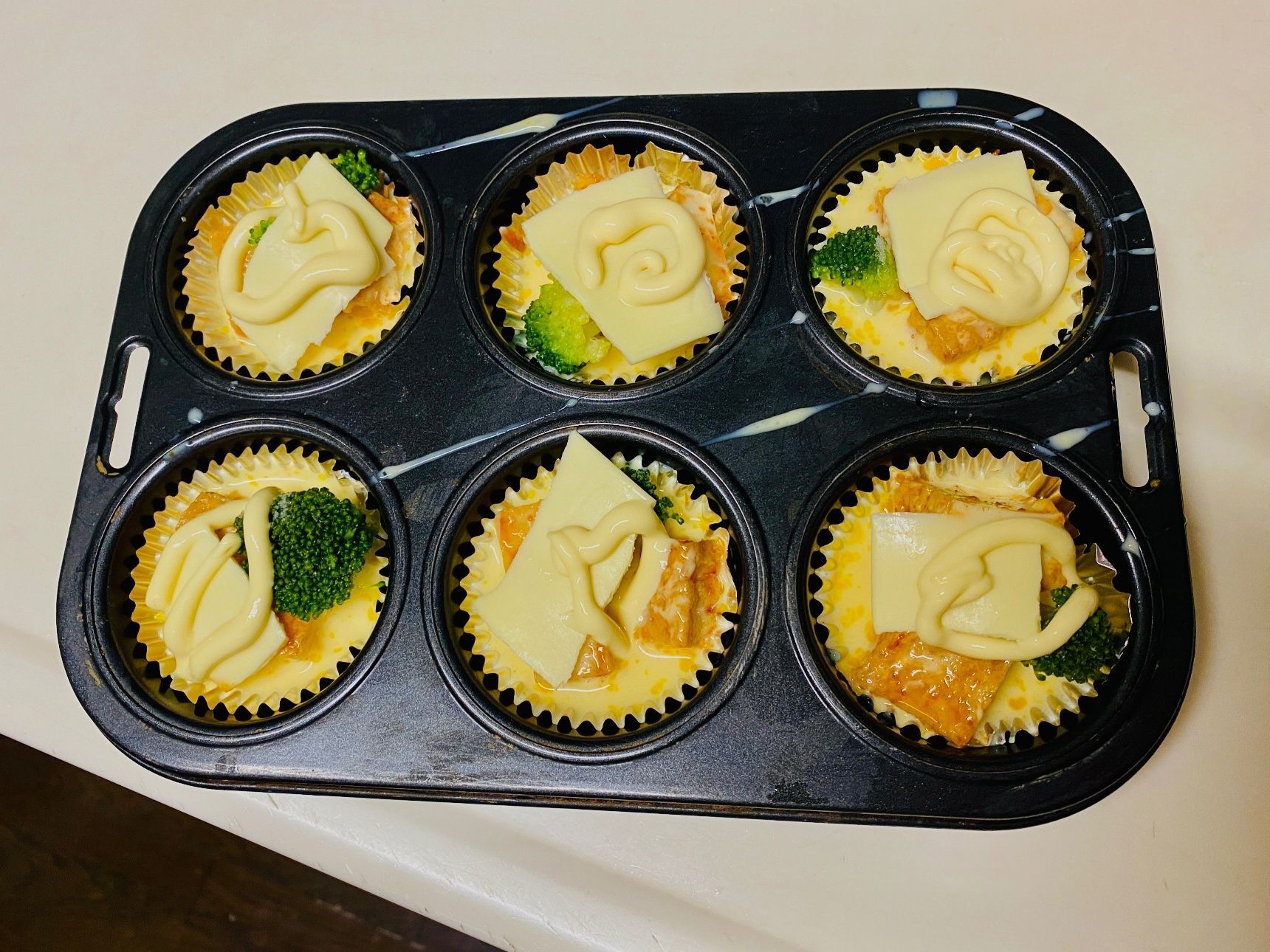 チーズをちぎってのせます。マヨネーズをクルンとかけます。
