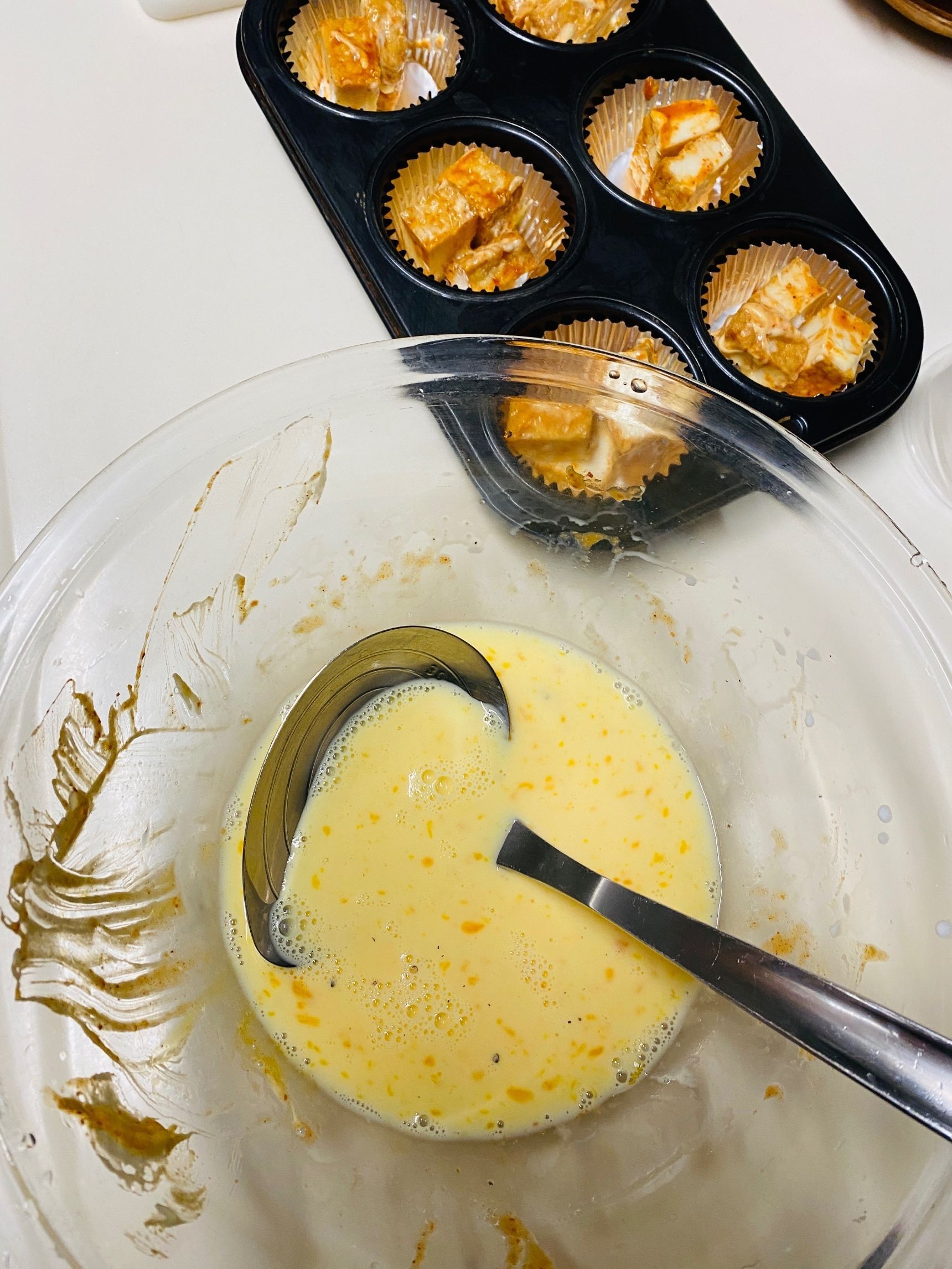 ③ボールは洗わずにそのまま使い、卵を割り、よく混ぜます。