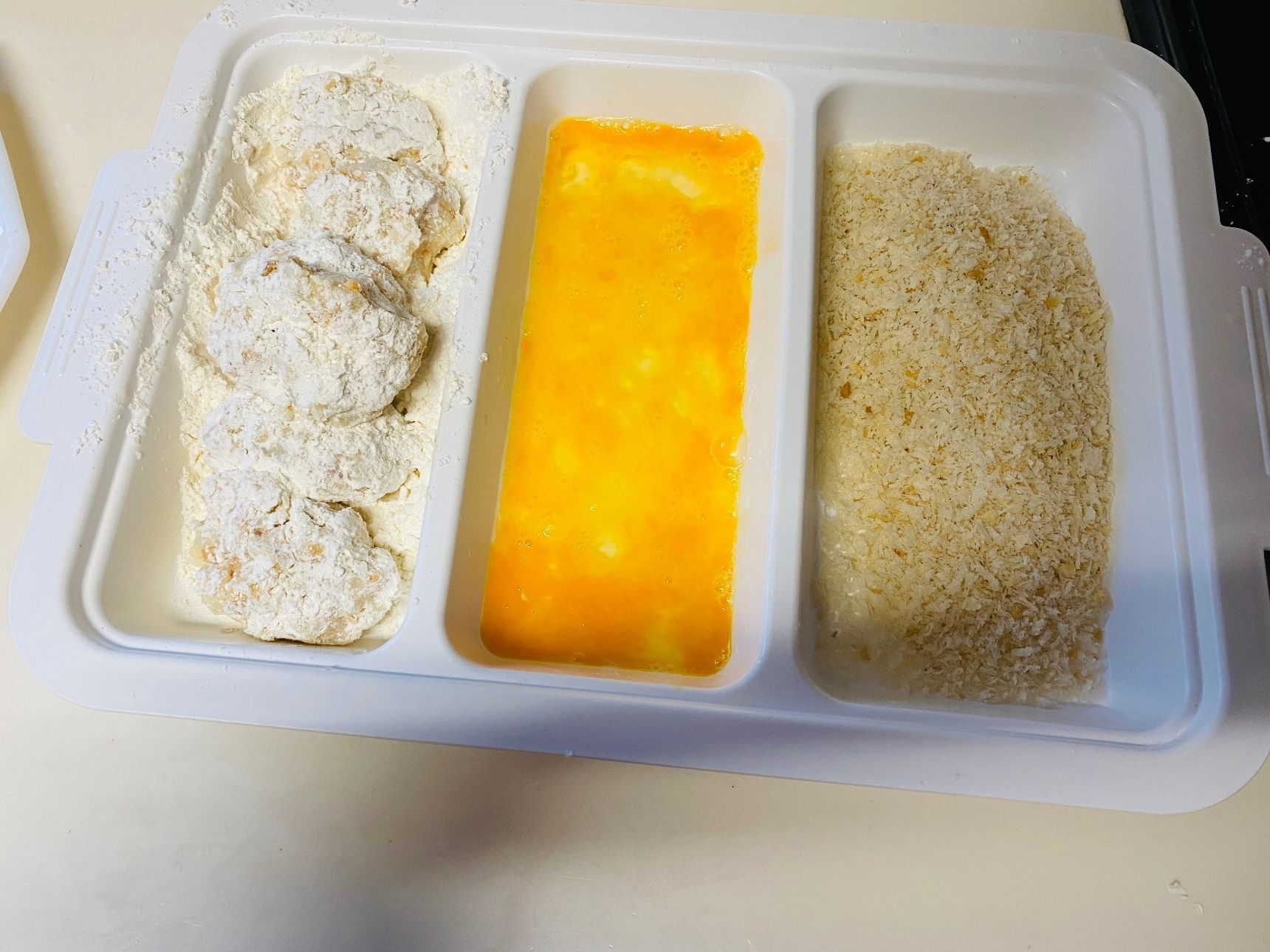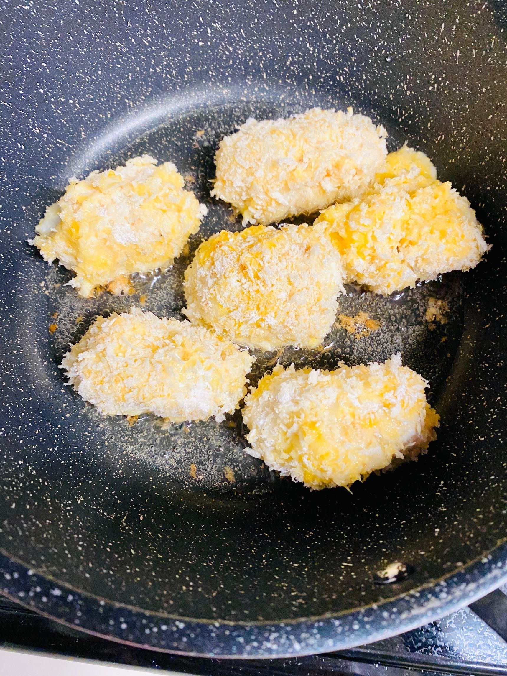 形を小判型に整え、小麦粉、溶き卵、パン粉の順番に衣をつけます。