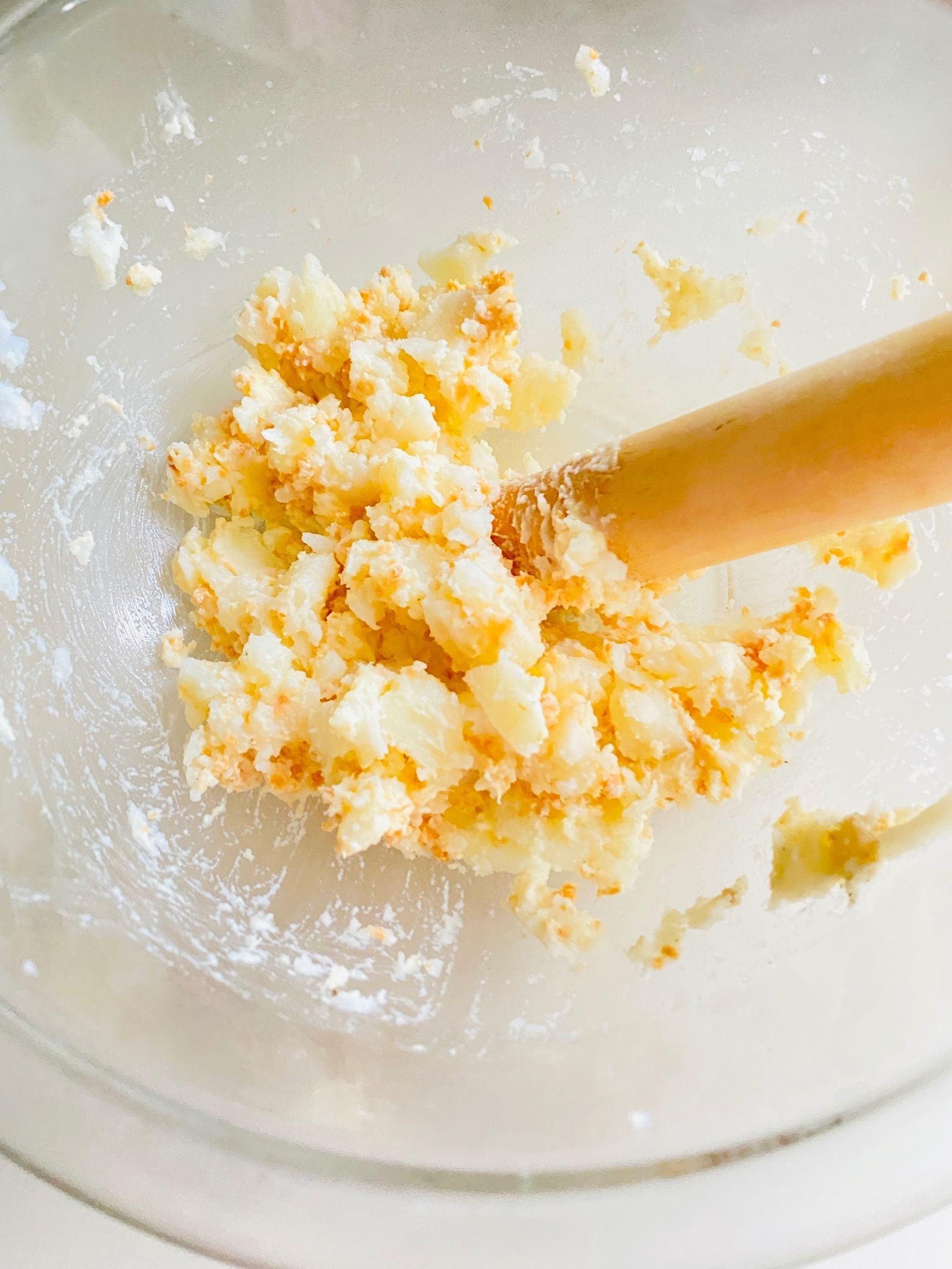 水気を切ってボールに入れ、麺棒などでよく潰します。