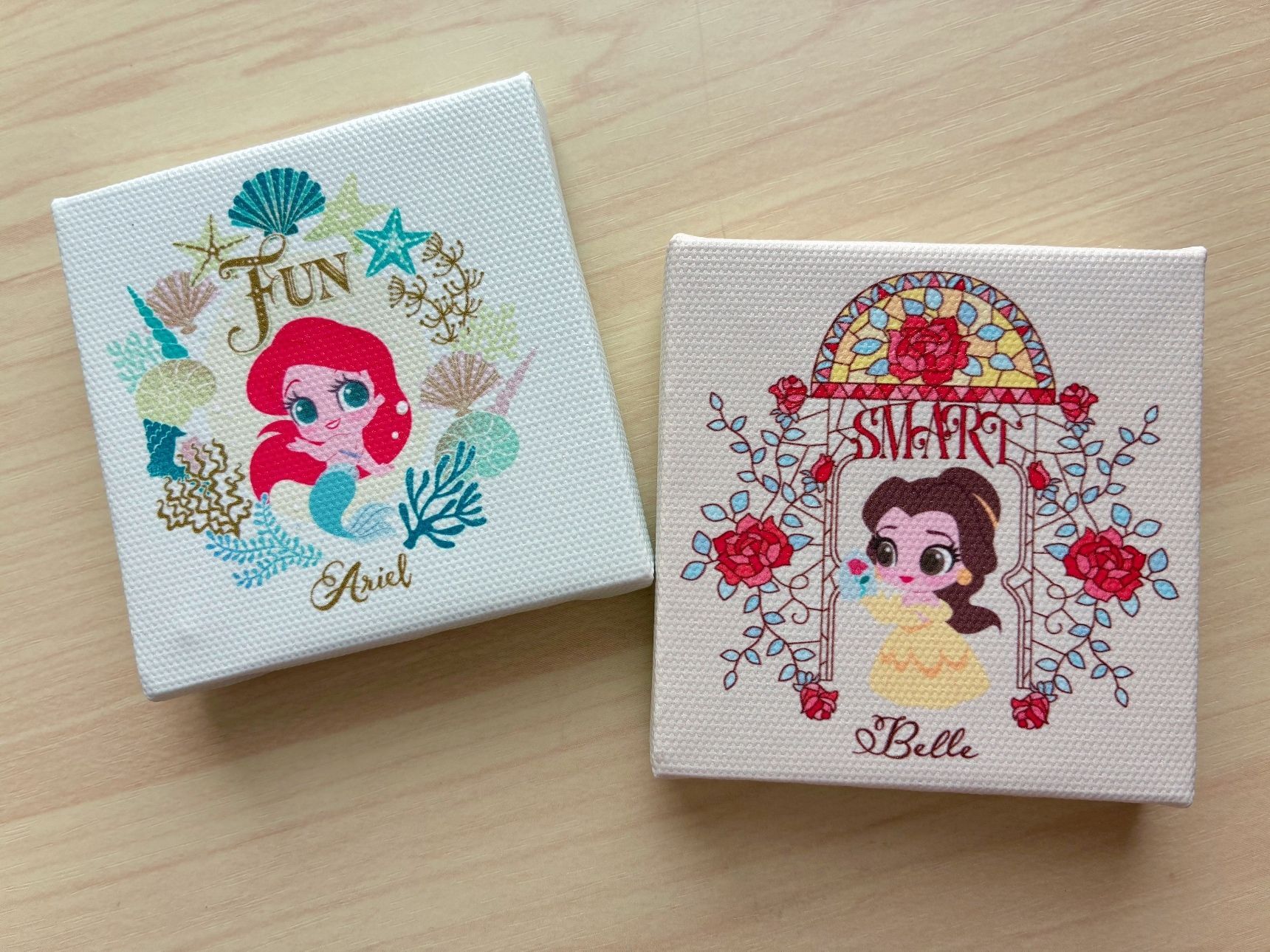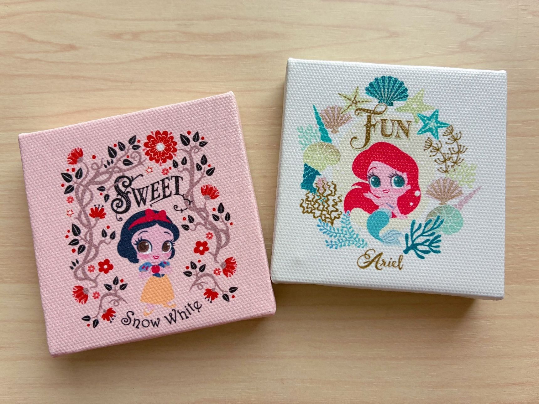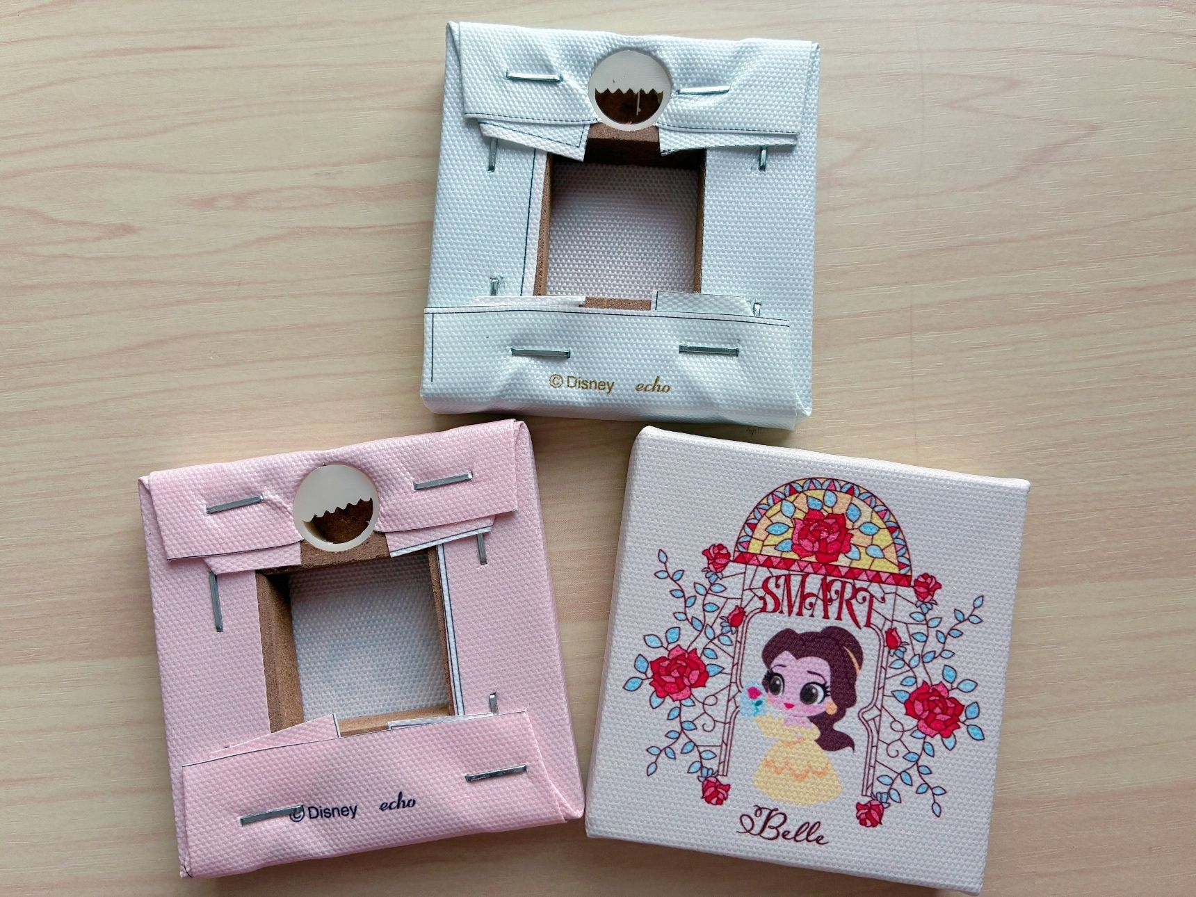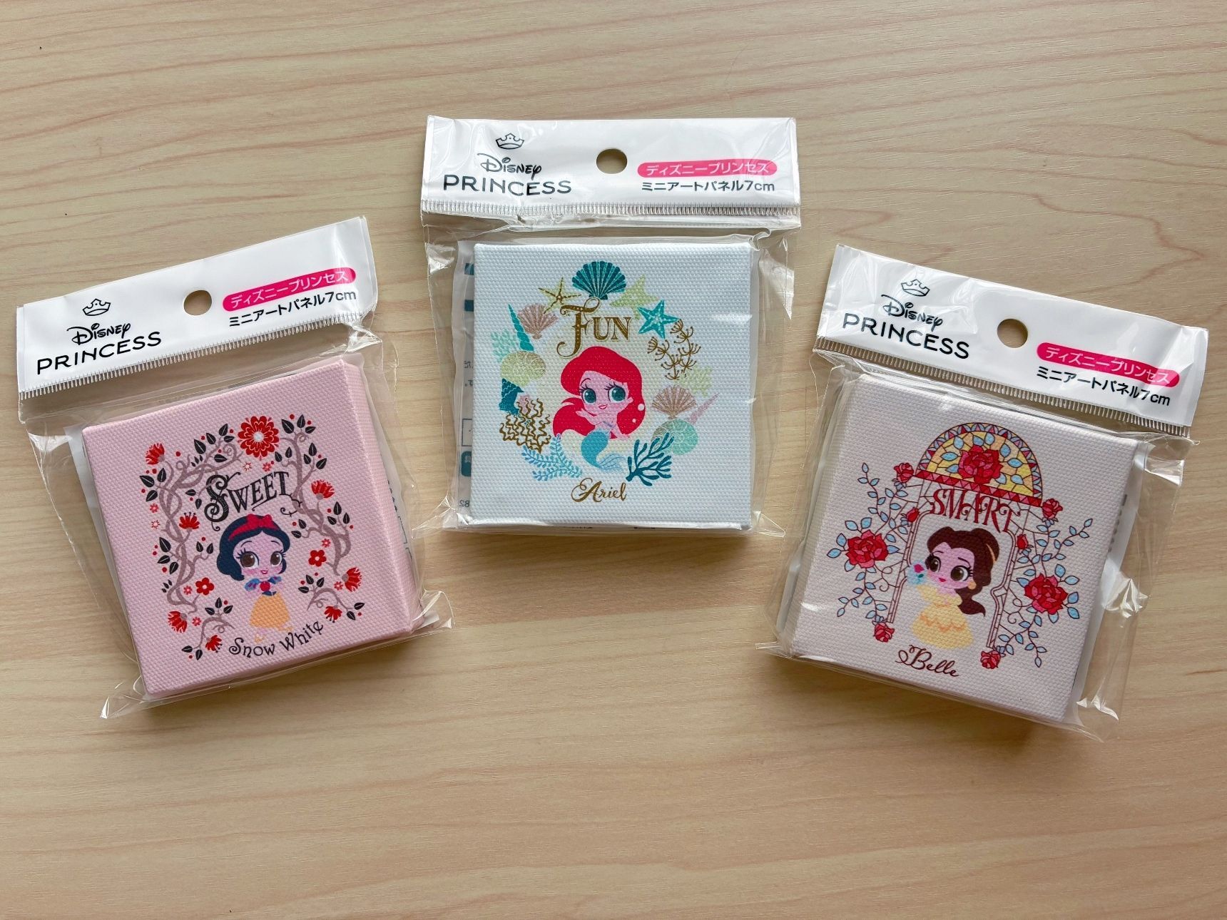 約7×7×1.3cmのサイズで絵柄の生地はポリエステル。裏にピンをかける穴があり厚みがあるので立てかけ飾ることもできますよ。
