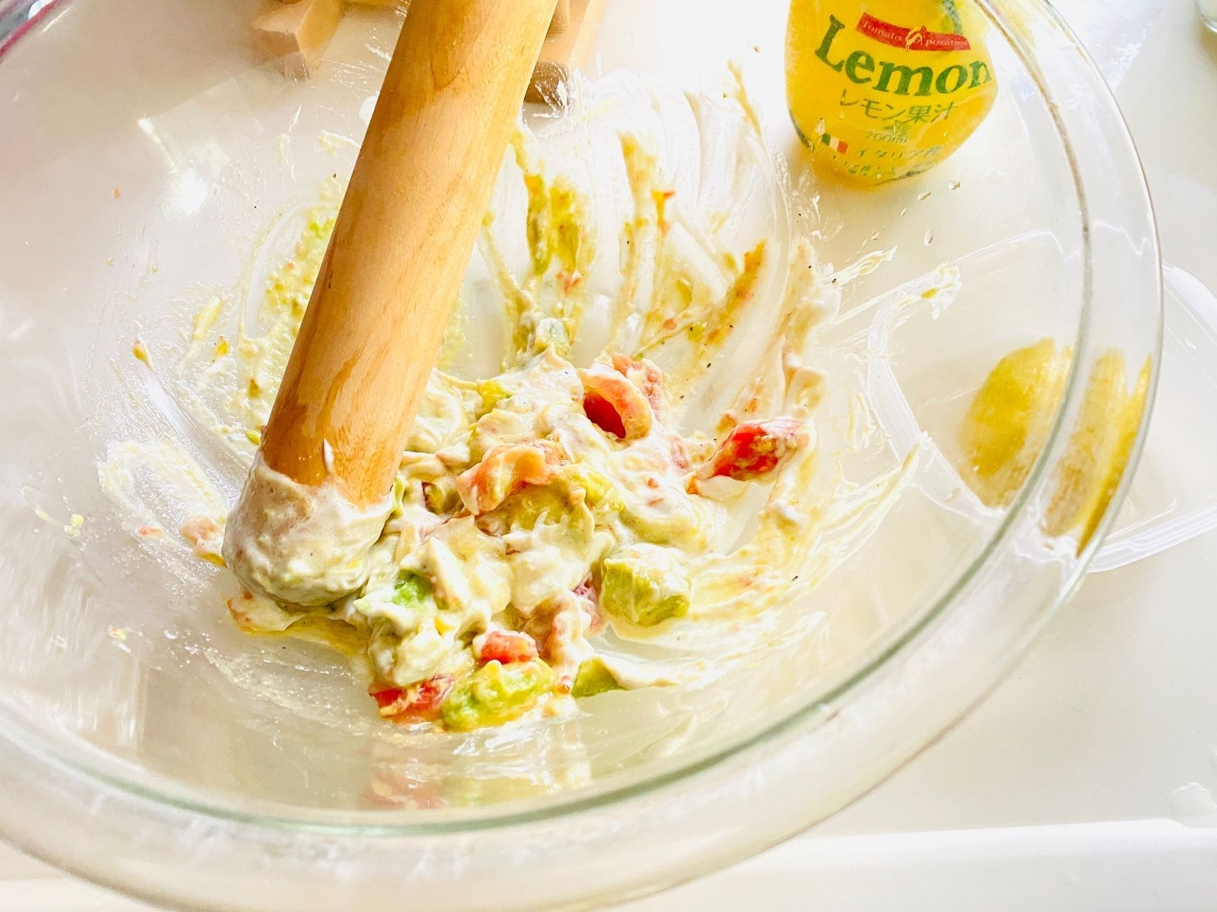アボガドをお好みのかたさに潰します。細く切ったトマト、玉ねぎを入れます。レモン果汁大さじ1、塩胡椒適量、サワークリーム大さじ2(※ギリシャヨーグルトで代用)を入れ混ぜます。お好みで、チリパウダー、パクチーを入れます。
