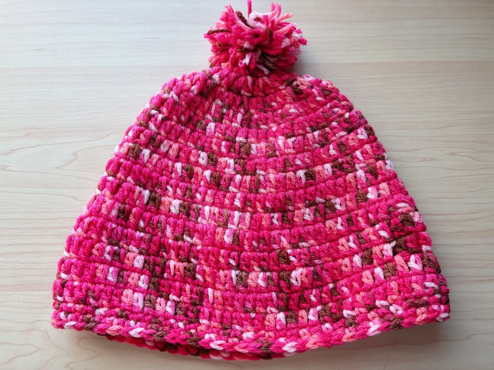 被り口を2段編んで完成です。丈は約23cm、頭回りは約63cm。