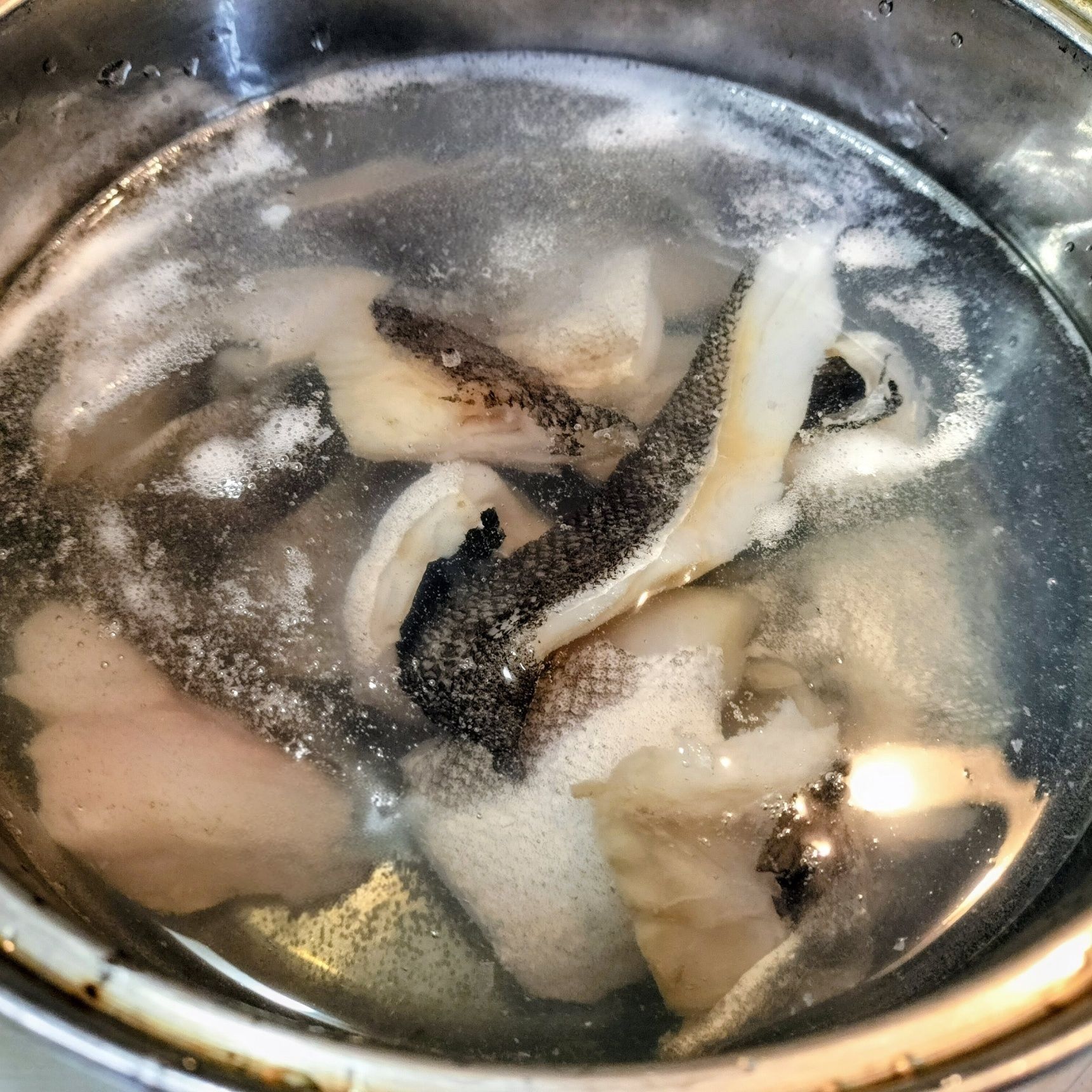 5. 手順3の鉄鍋に、手順4の大根と鱈を加える→鱈に火を通す