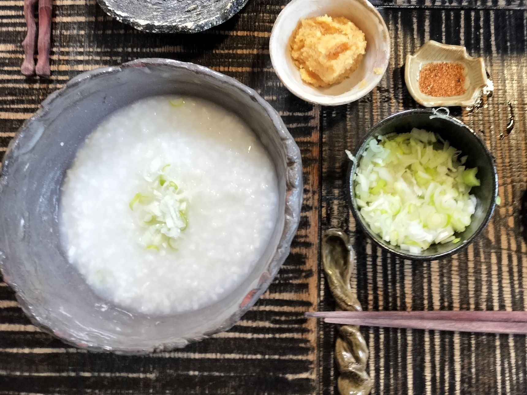 8割ほど食べ終わったら、上記画像の〆のお粥セット(お粥・フンドーキン合わせ味噌・長ネギ)を加えて、ひと煮立ちさせる【〆のお粥完成】