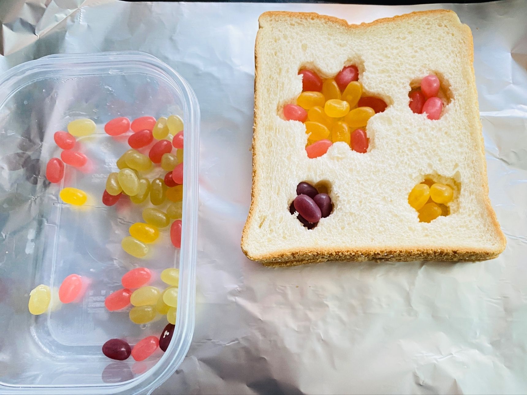 1.食パンをクッキー用の型抜きを当てて型抜きします。 2.型抜きをしていないもう1枚の食パンの上に重ねます。 3.型抜きしたところに、グミをまんべんなく入れます。 4.180度に温めておいたオーブンで10分ぐらい焼きます。焼き上がり時間は調整してください。