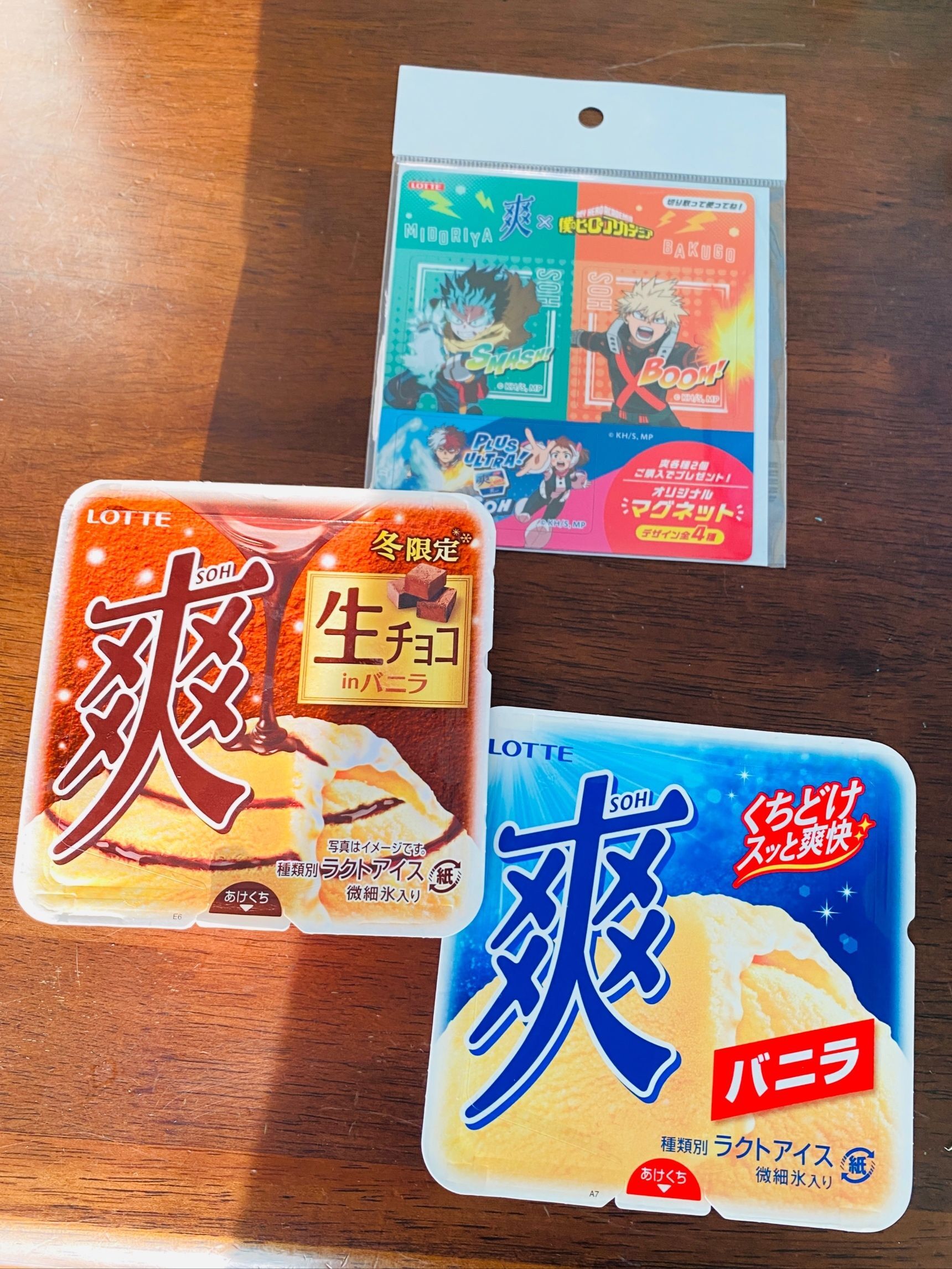 期間限定で今ならお好きな爽を2個買って、ヒーローアカデミアのマグネットが1枚4種類の中から選べますよ。