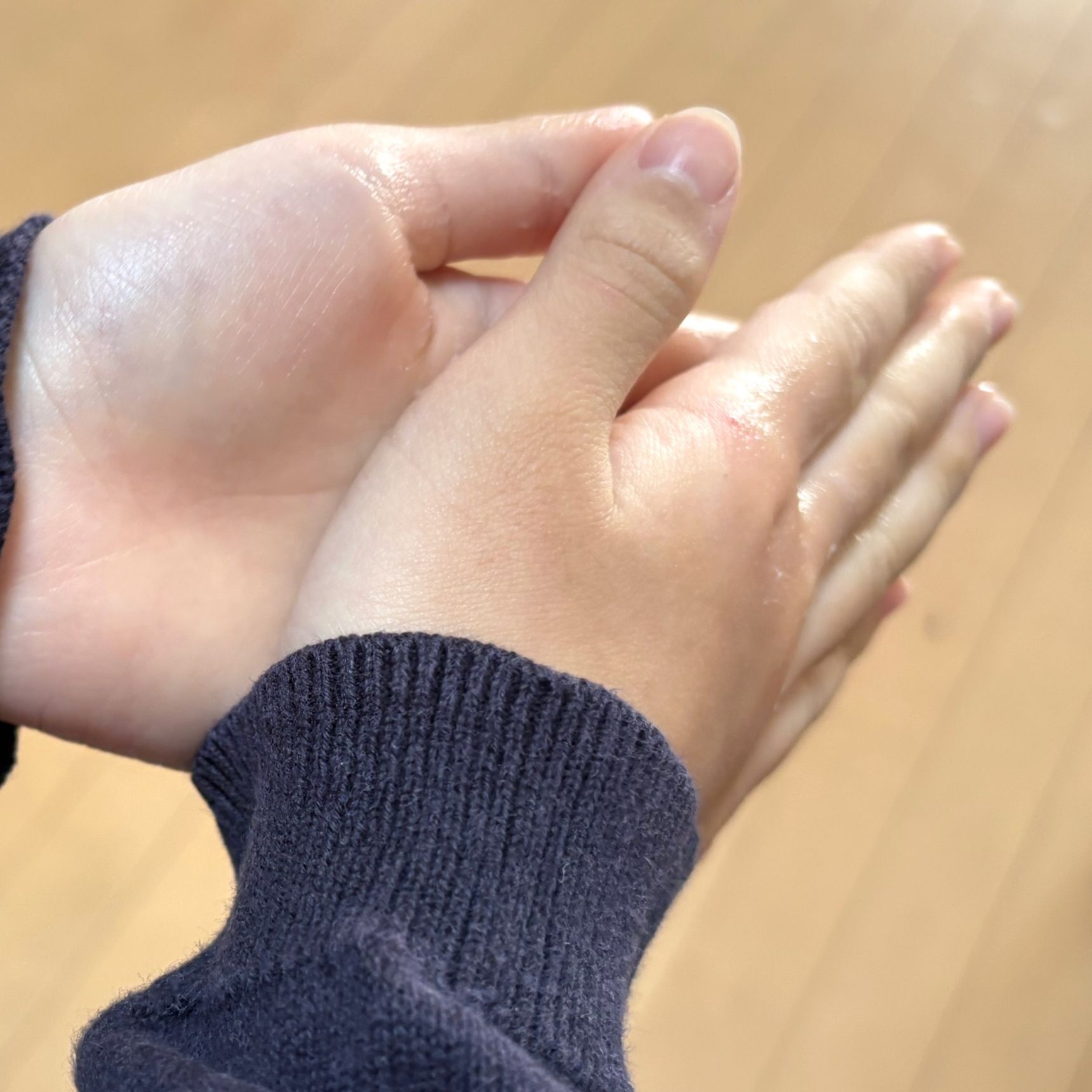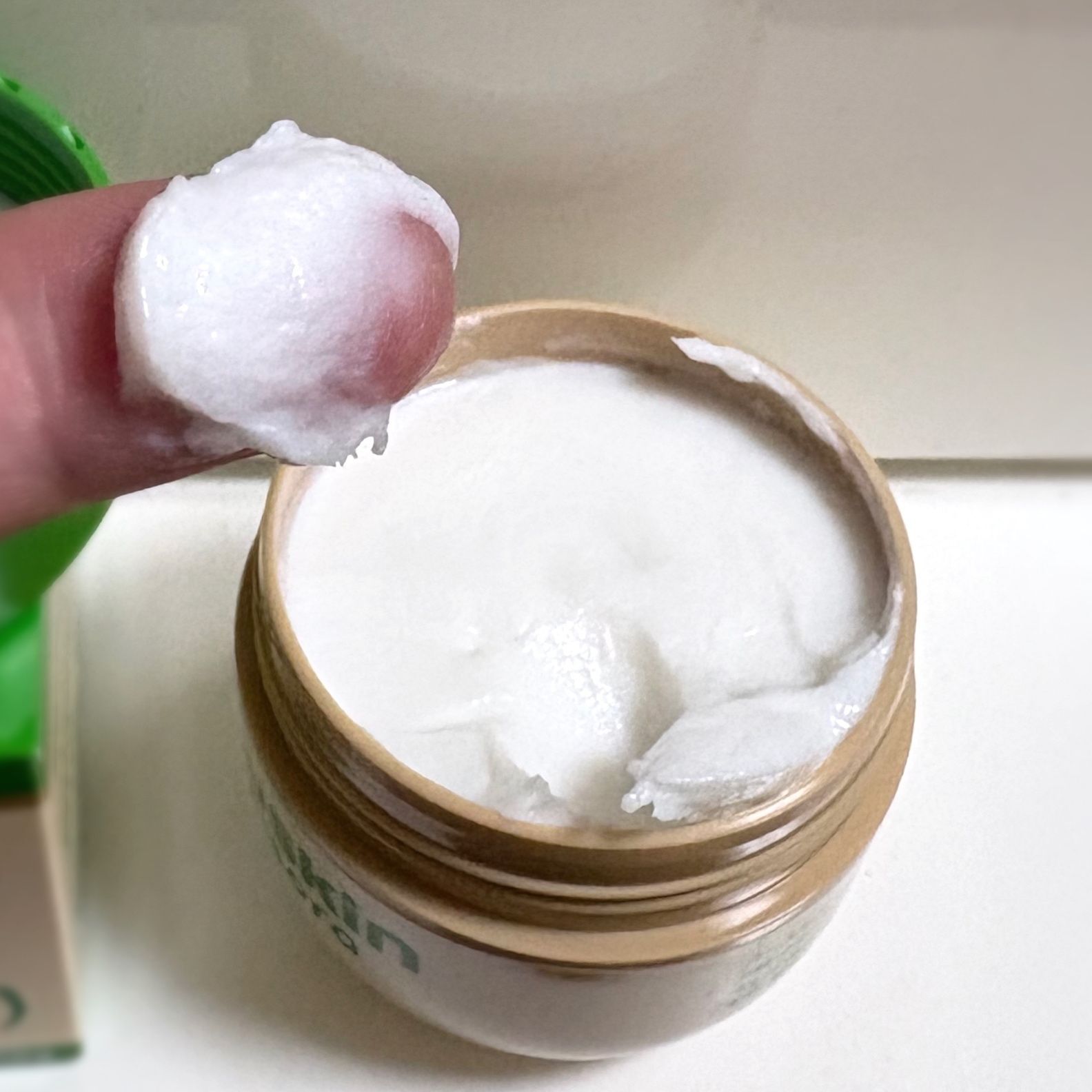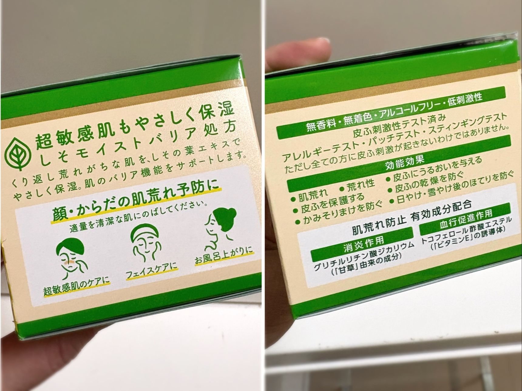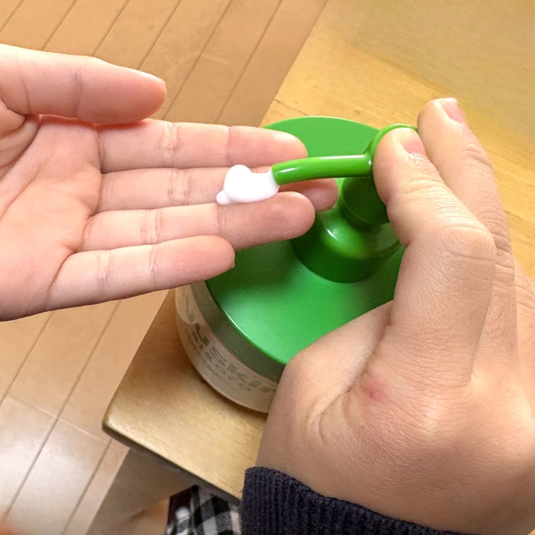 先ほどのローションと比べると、しっかりとしたクリーム状になっていて、手にぬるとしっとりと感じました。