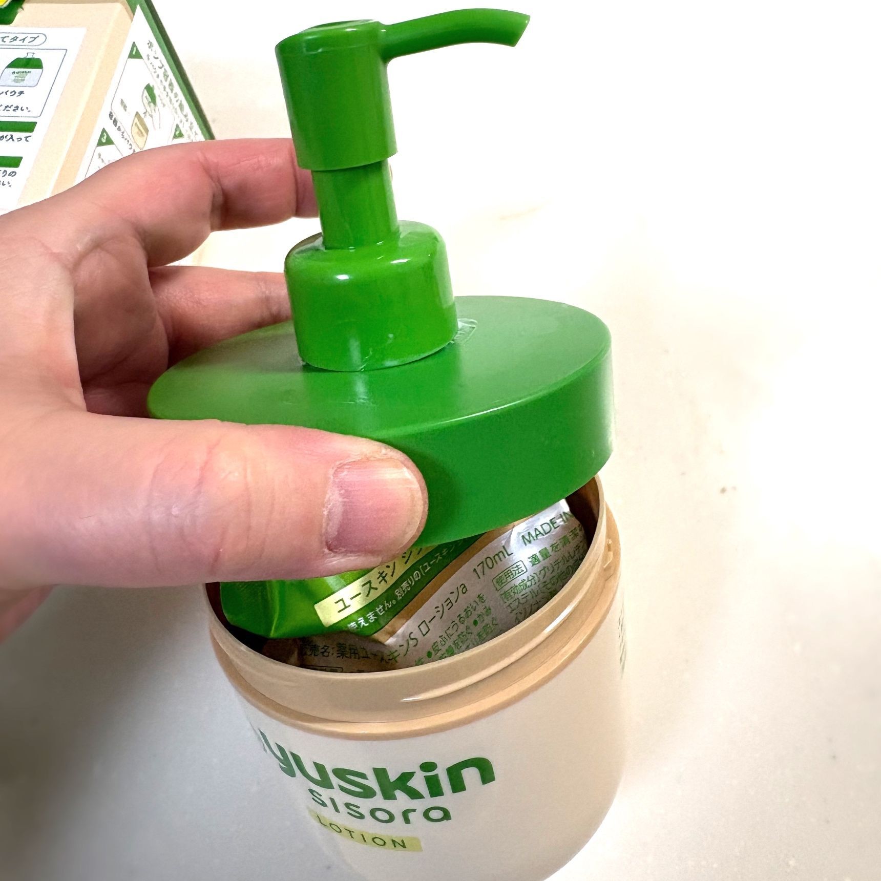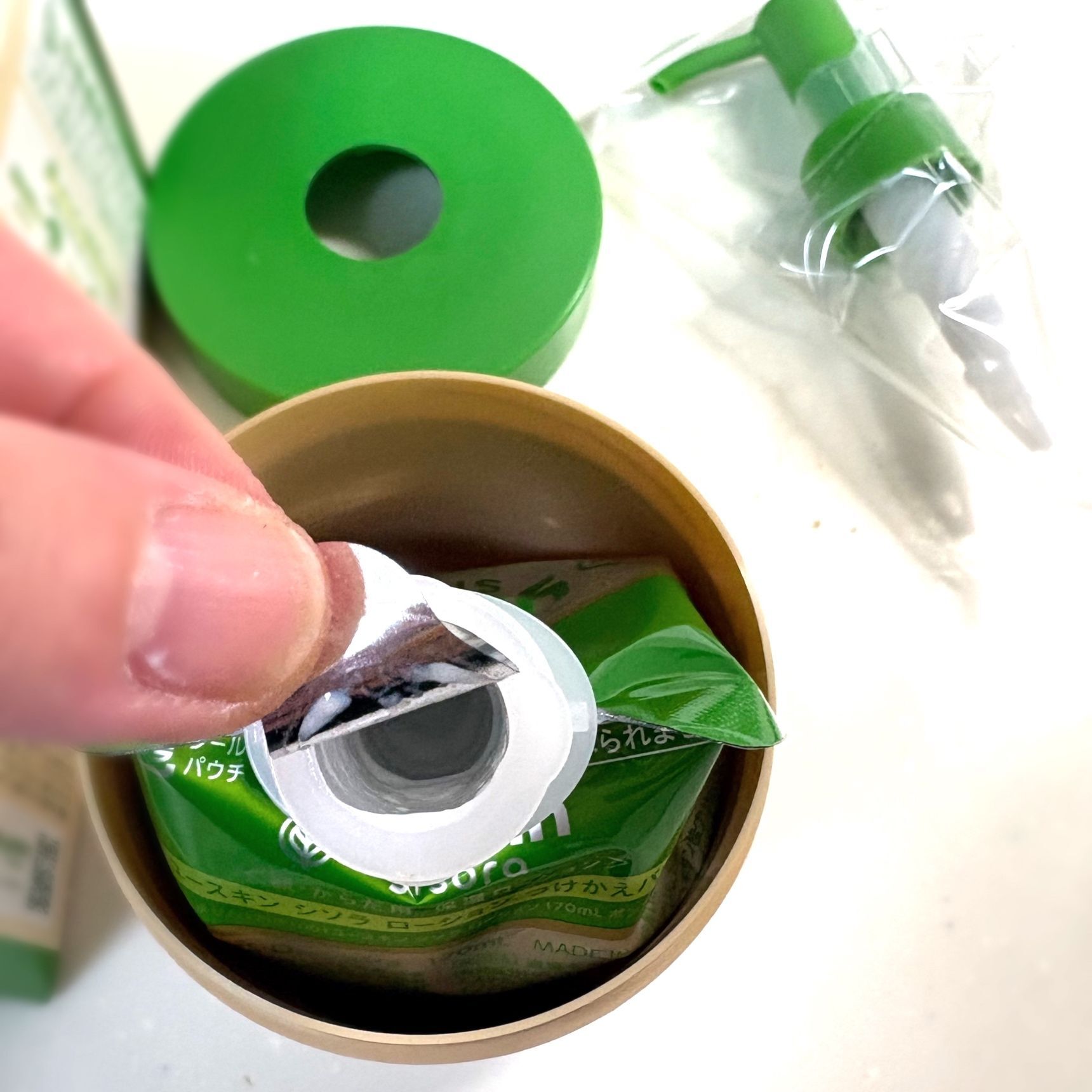 パウチにキャップを被せたら、ポンプを差し込んでキャップを回します。