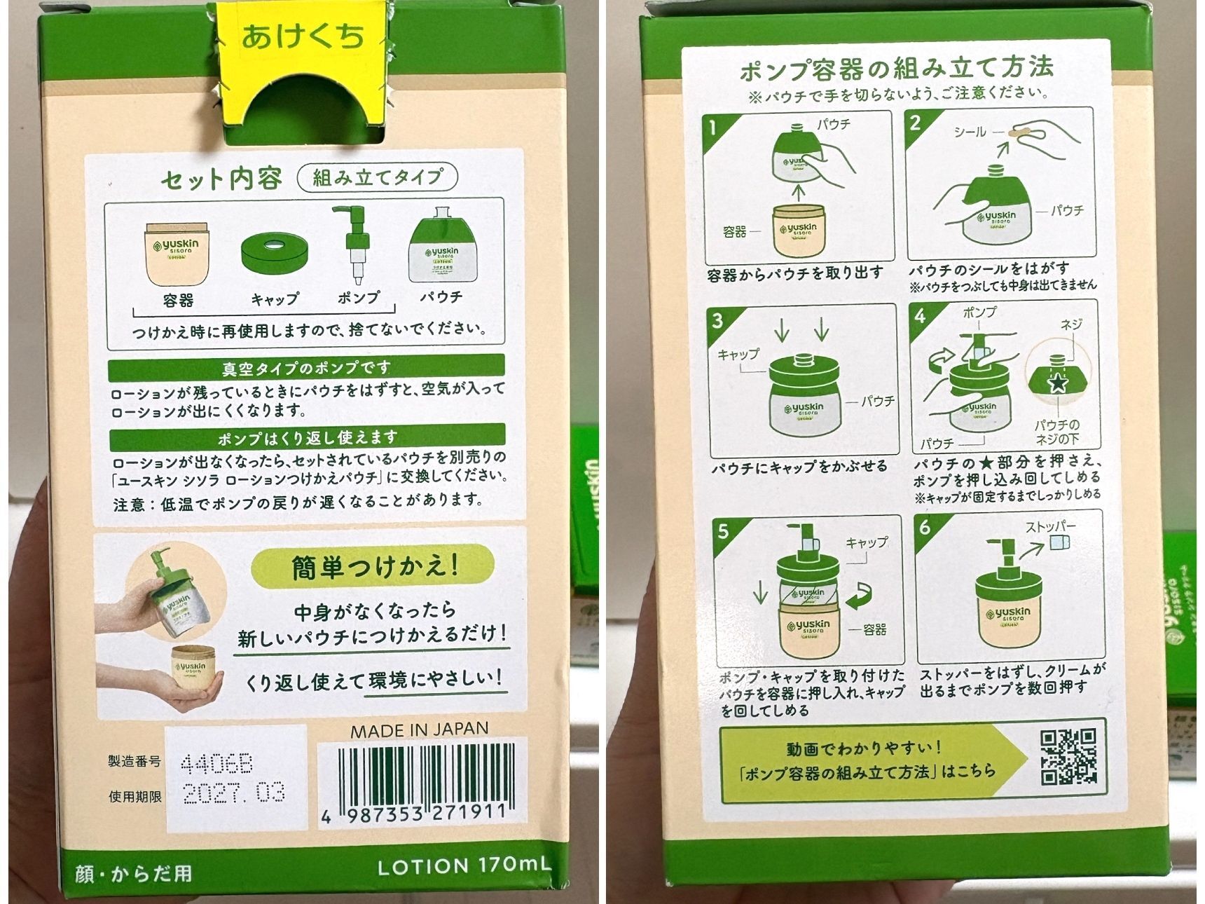 中身はコチラ。箱の中には、容器のほかキャップやポンプ、パウチ状のローションが入っています。