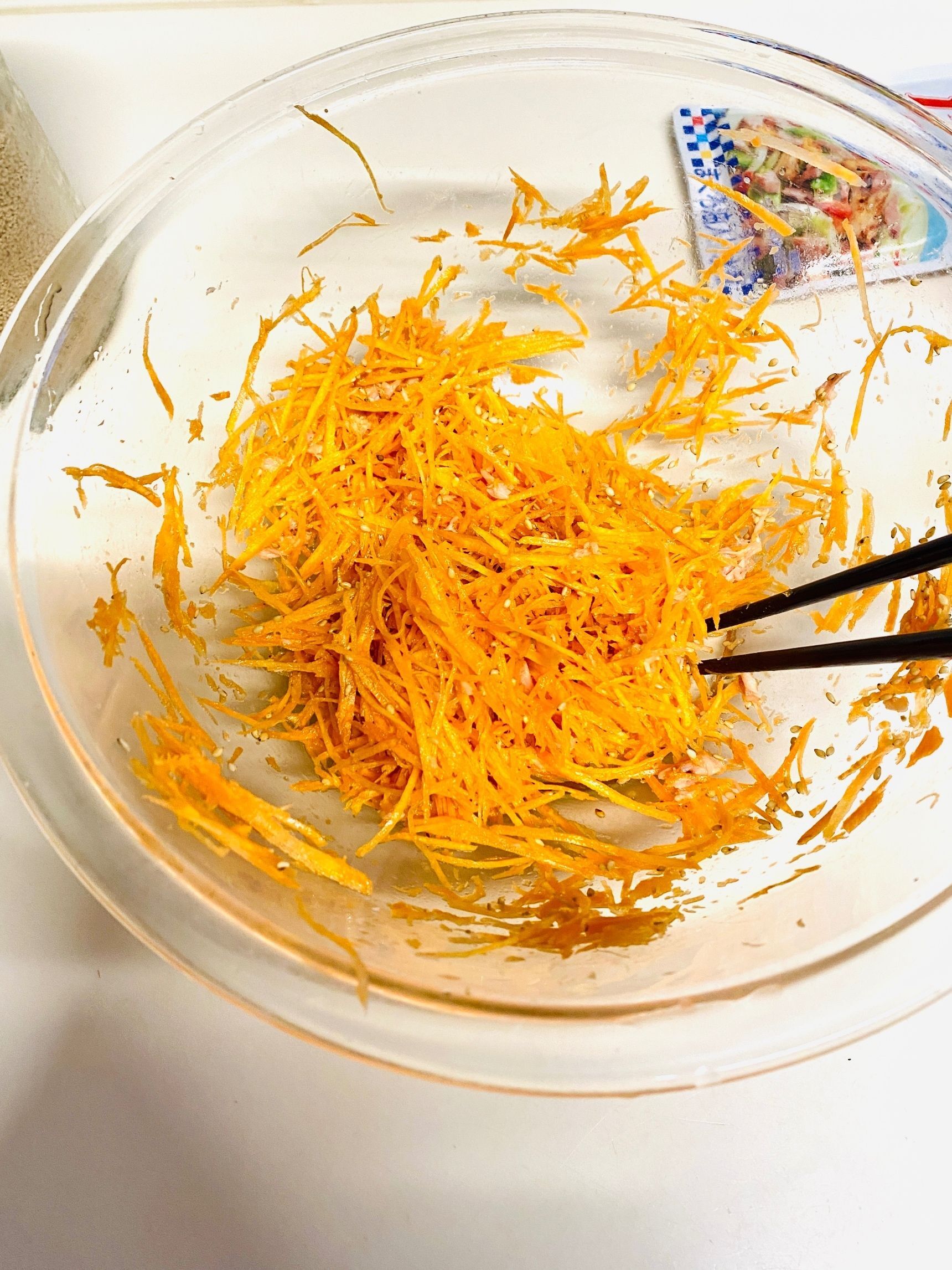 人参はせん切りにします。 電子レンジ600Wで30秒ぐらい加熱します。 の調味料を加えて混ぜます。