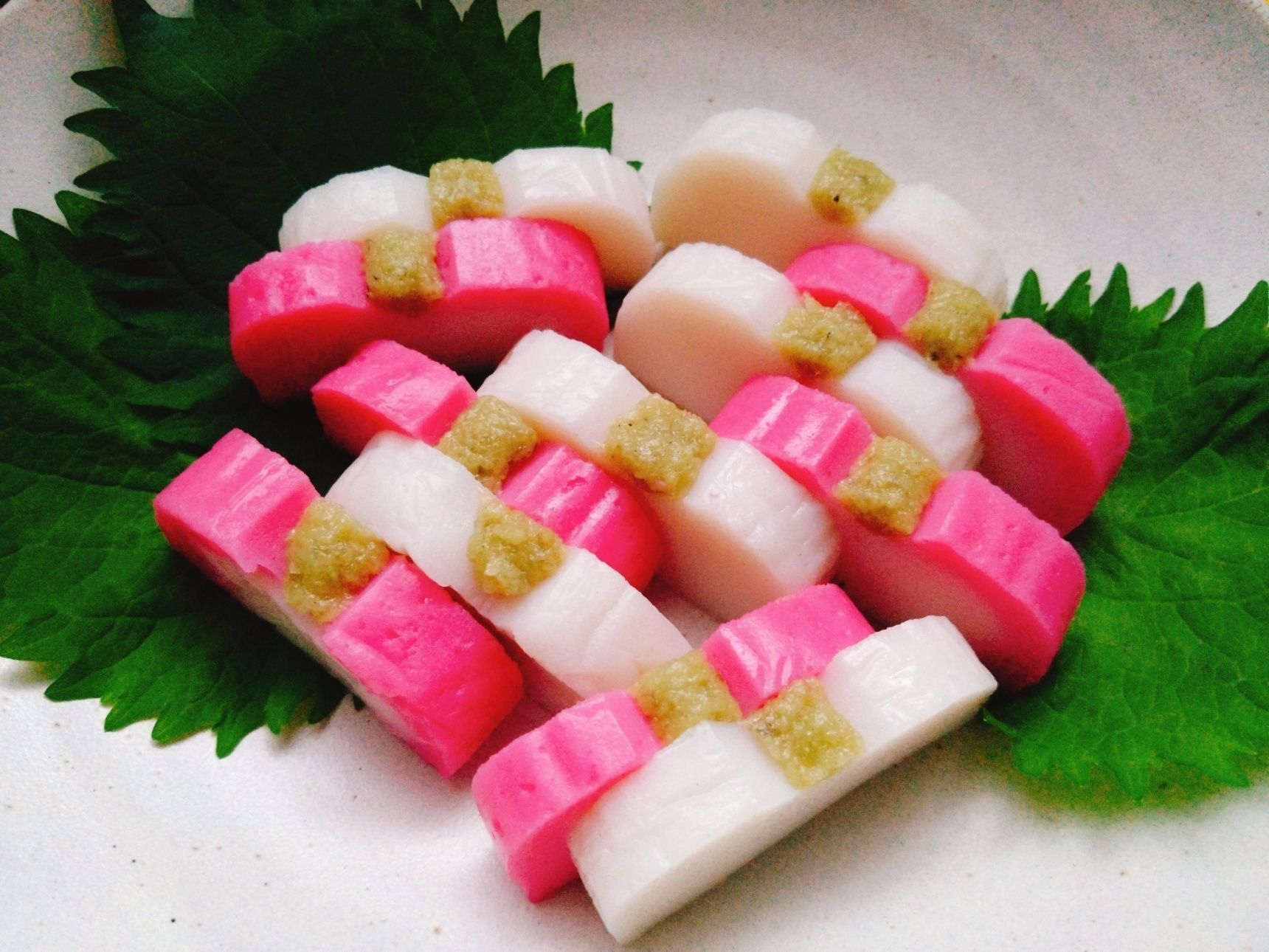 作り方 1.かまぼこは板から外し、縦中央部分に斜めの切り込みを左右2本入れて中央を切り取る(三角形の切り込み)。 2.切り取った部分にわさびを詰めて食べやすく切ったら完成。