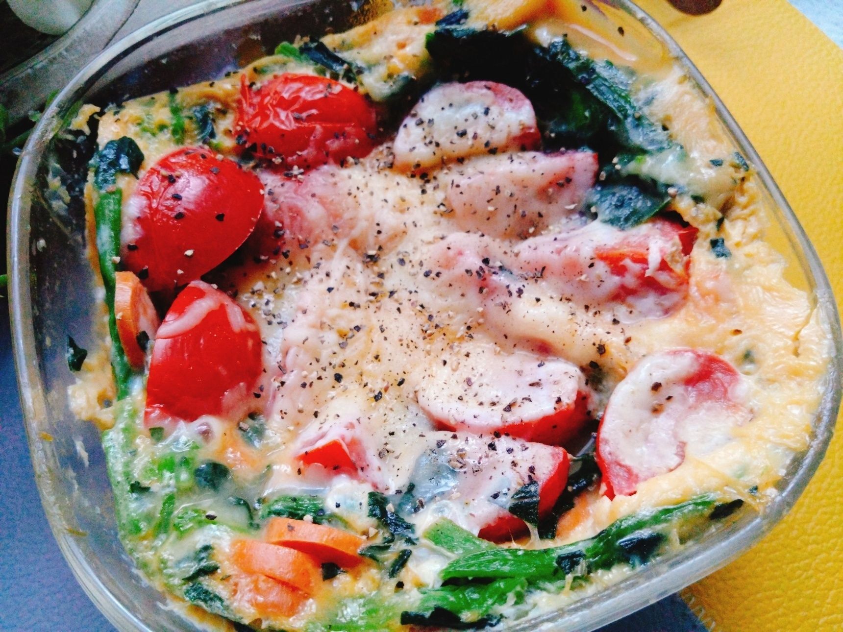 混ぜてレンジでチン‼美味しい具だくさんのキッシュの完成!具はお好みで変えて作ってくださいね。