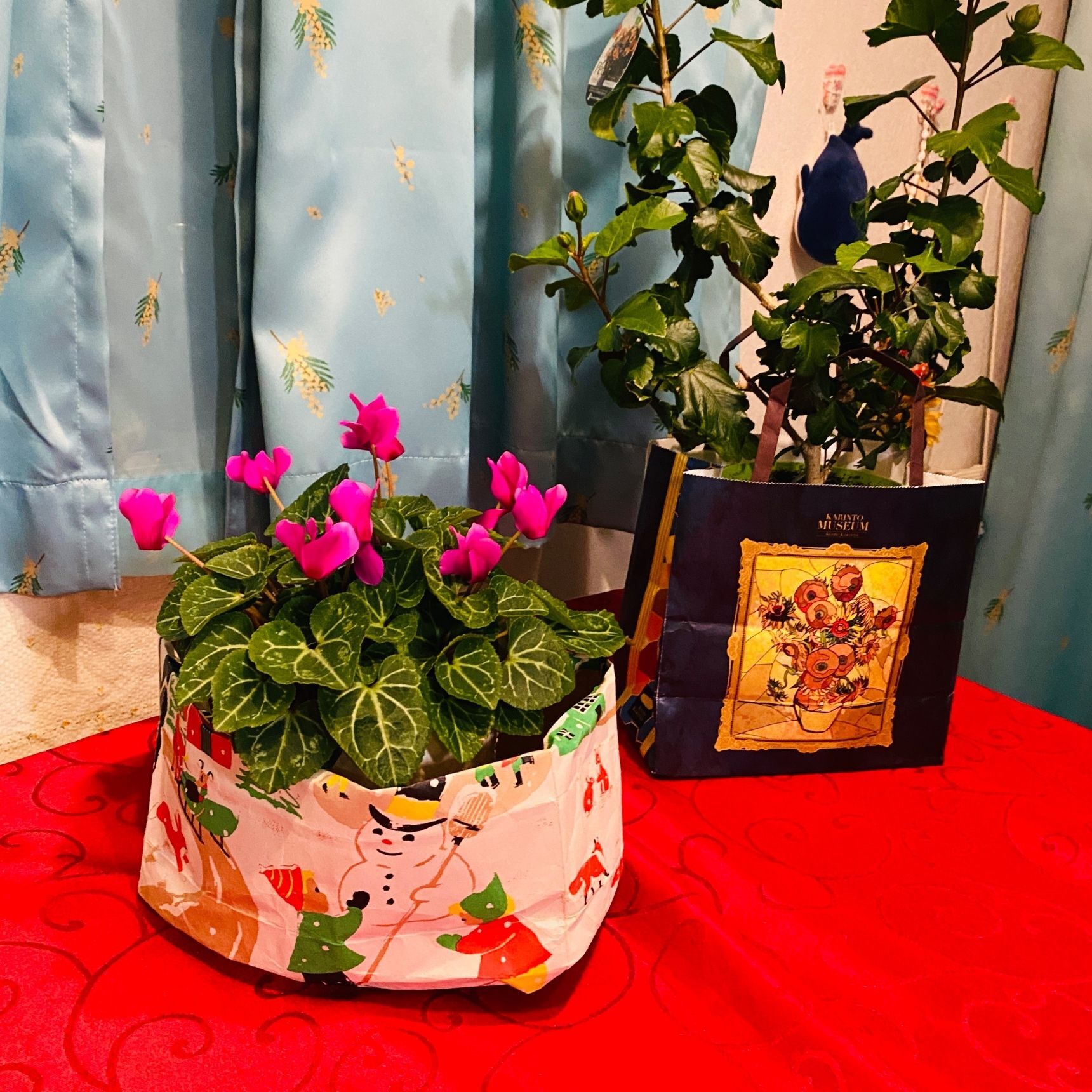 冬に入り、鉢物も紙袋で鉢カバーすると、保温されて寒さ対策にもなりますよ。