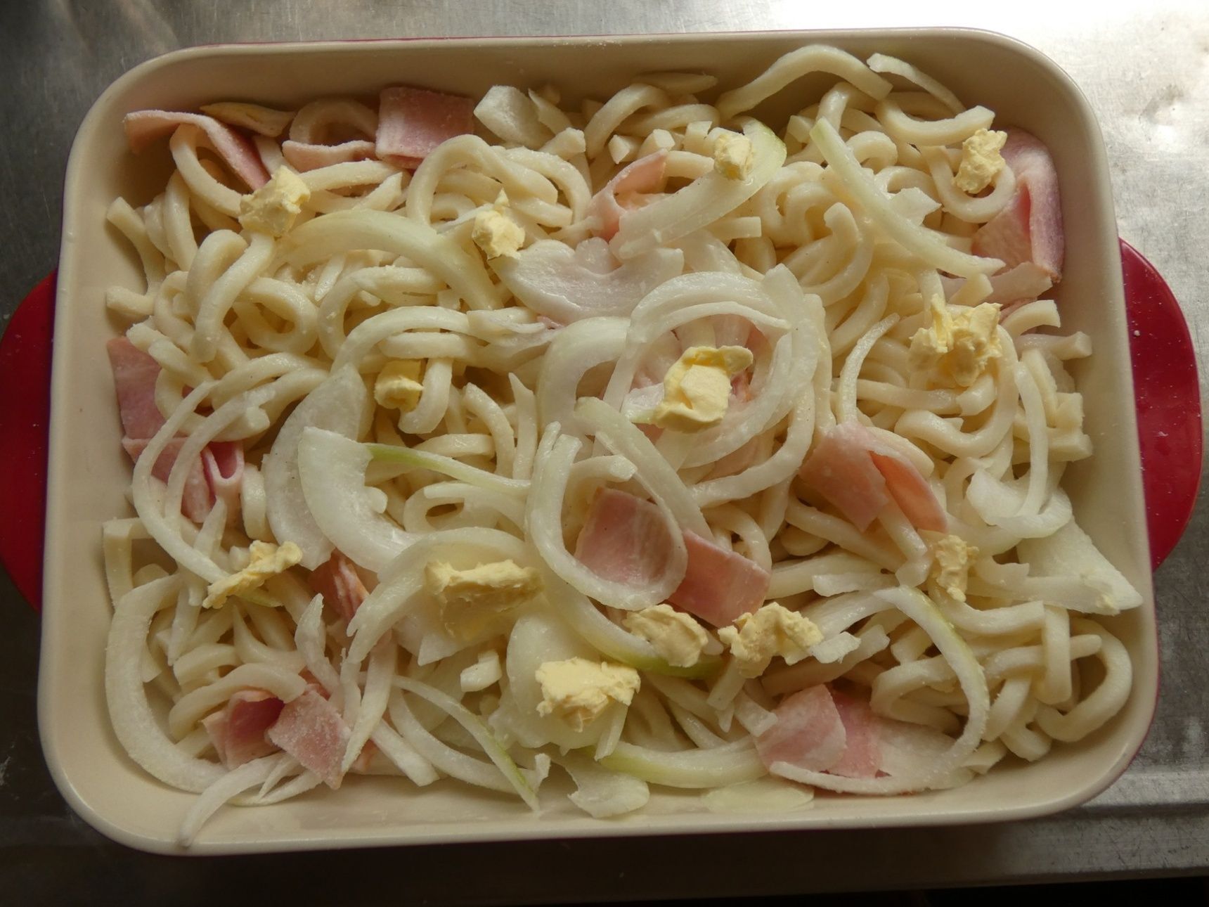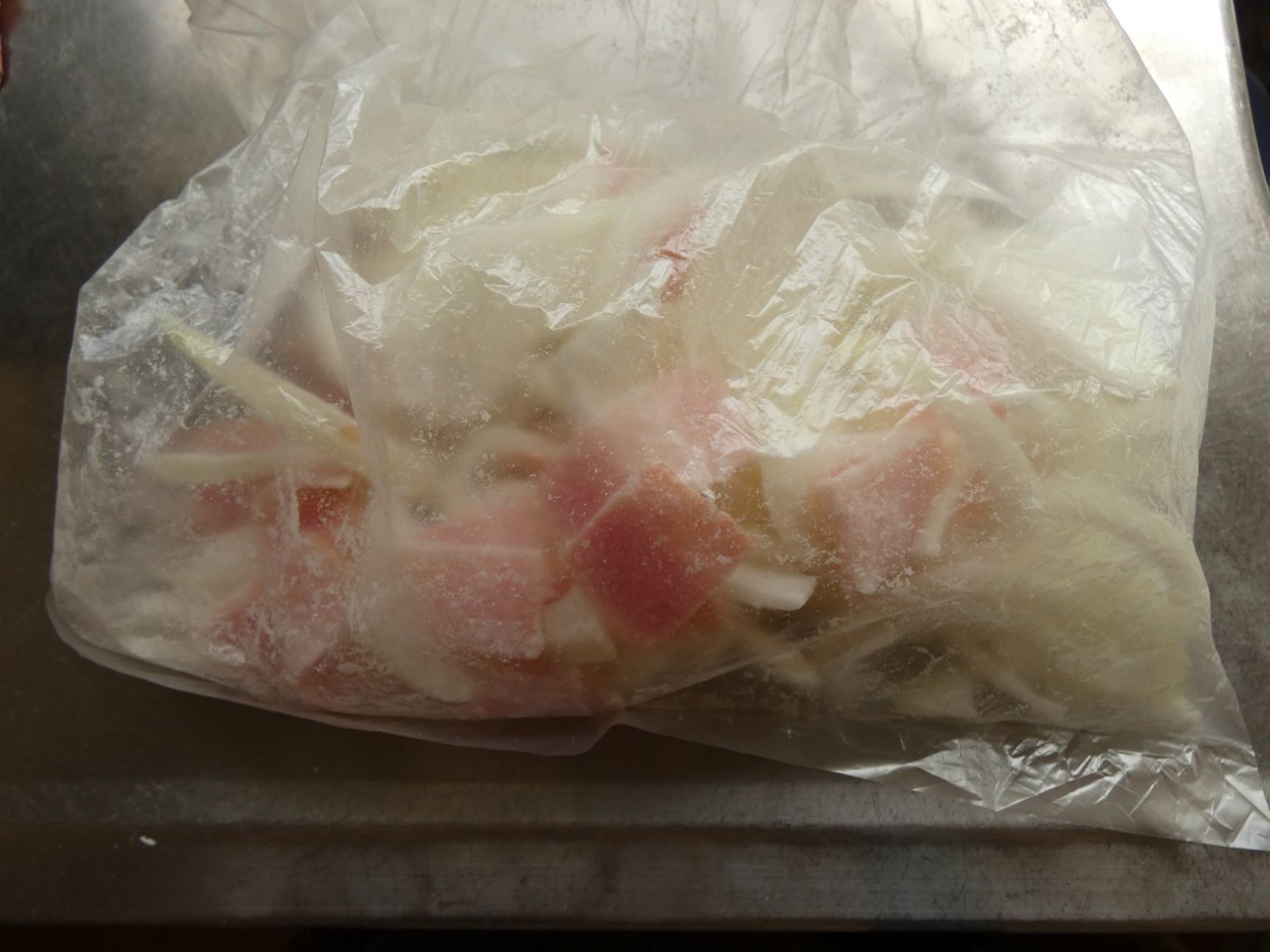 うどん、ベーコン、玉ねぎ、米粉、塩コショウをポリ袋に入れてよく振り混ぜます。