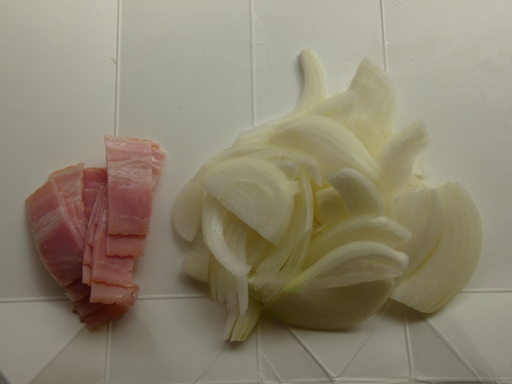 玉ねぎは薄切りにし、ベーコンは1cmの幅に切ります。