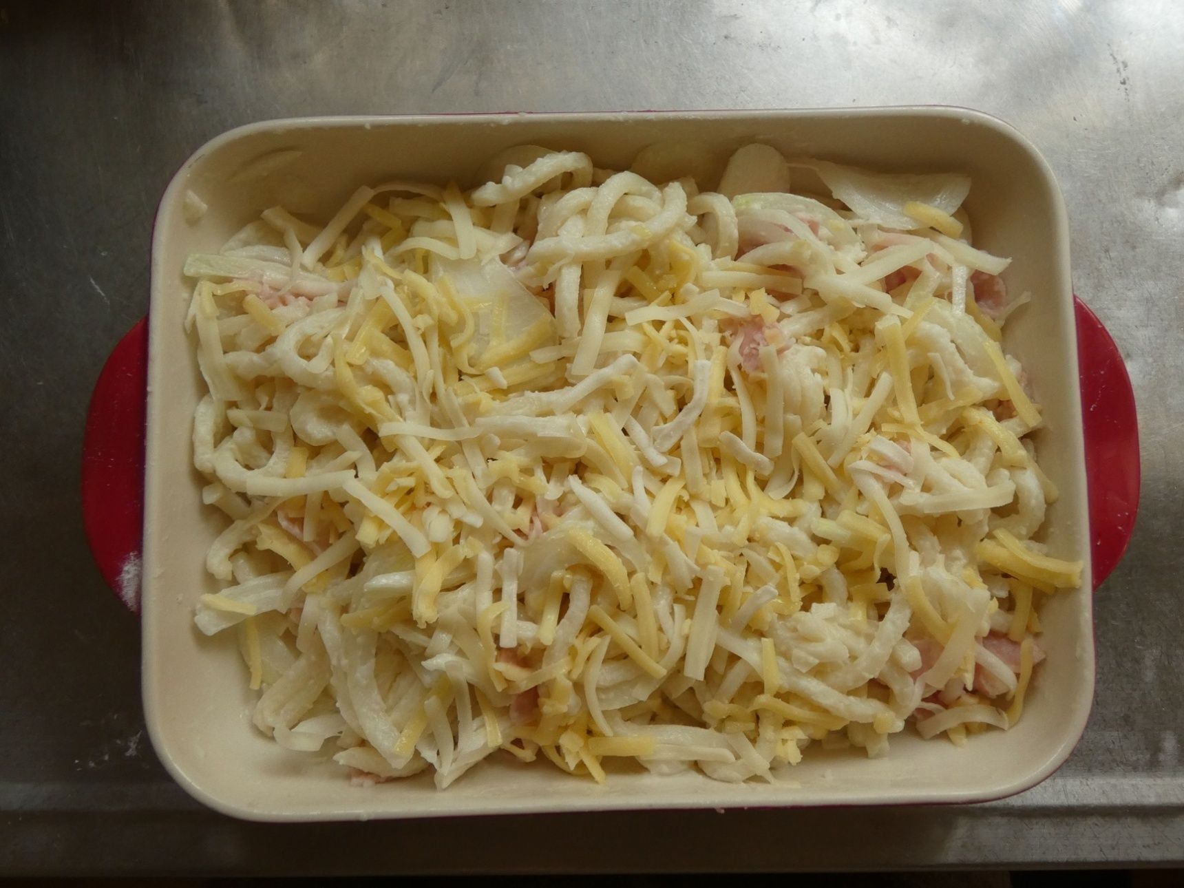 一度取り出して混ぜ、さらに3分加熱します。チーズを乗せてトースターで焼き、焼き色がついたら完成。
