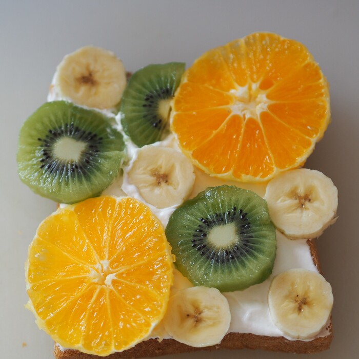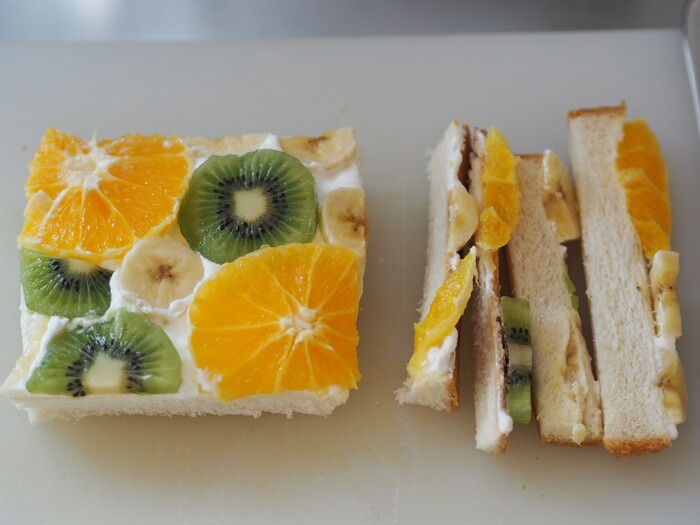 パンからはみ出すくらいにフルーツを乗せた方が、切った時にフルーツの断面が見えておいしそうに見えます。