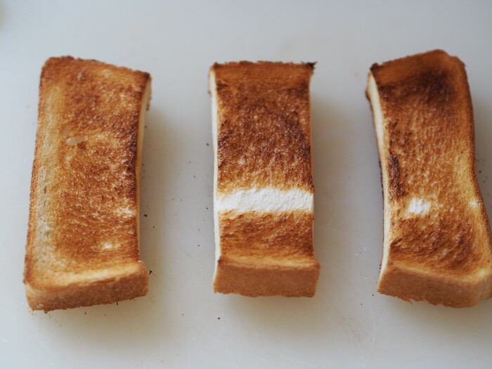 包丁をお湯で温めてから切ると断面がキレイに切れます。パンの耳を切り落とした方がさらに繊細な印象になります。
