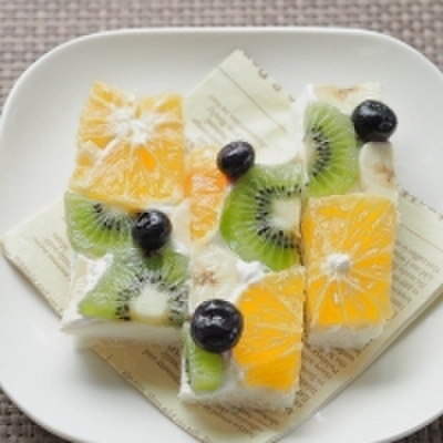 2.カットしておいたフルーツを1の食パンの上に隅々まで乗せます。