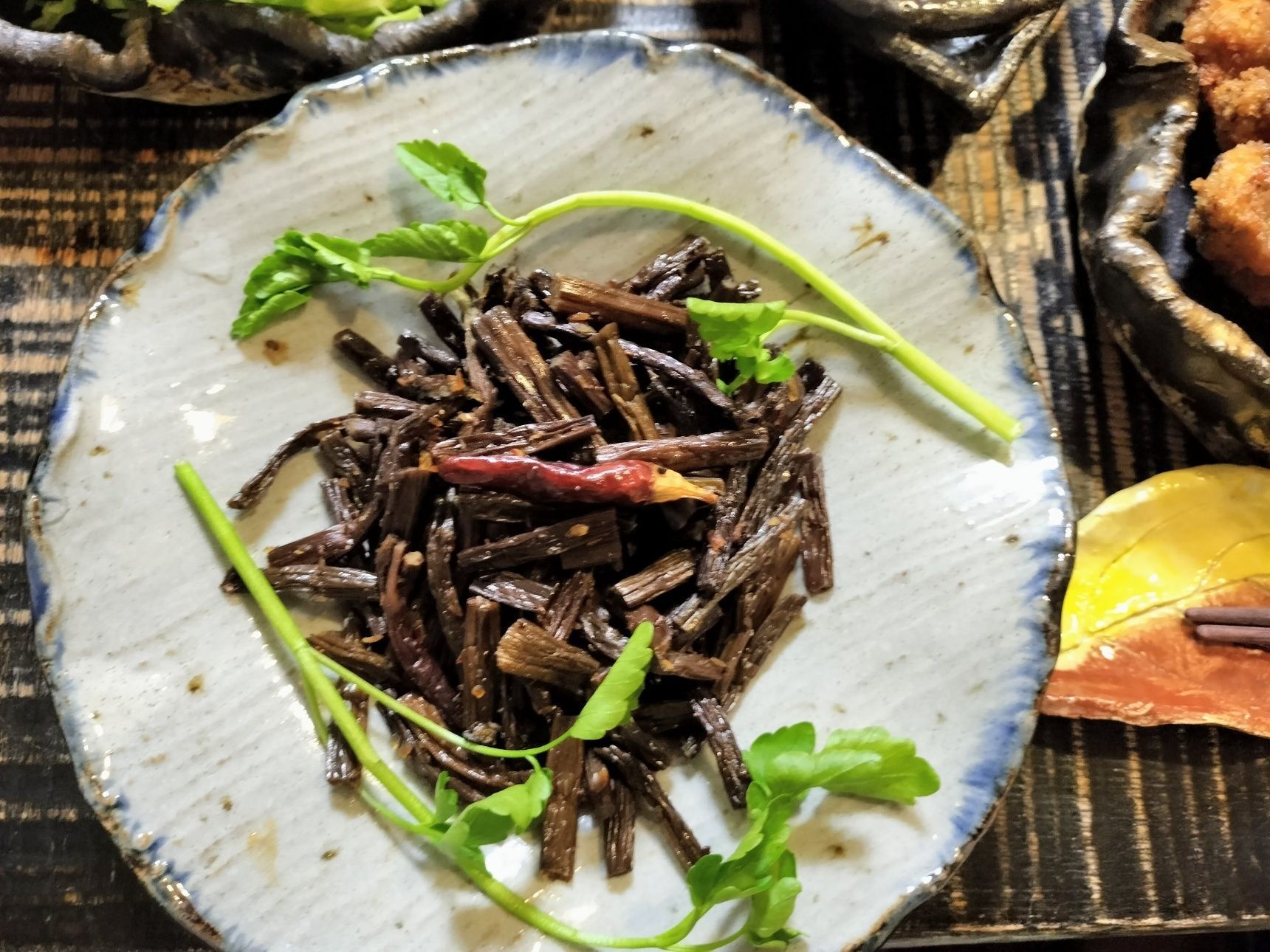 3.鍋に、ごま油と鷹の爪を入れて熱し、手順2のわらびを加えて、中火でサッと炒める→材料●を加えて、汁気がなくなるまで炒める