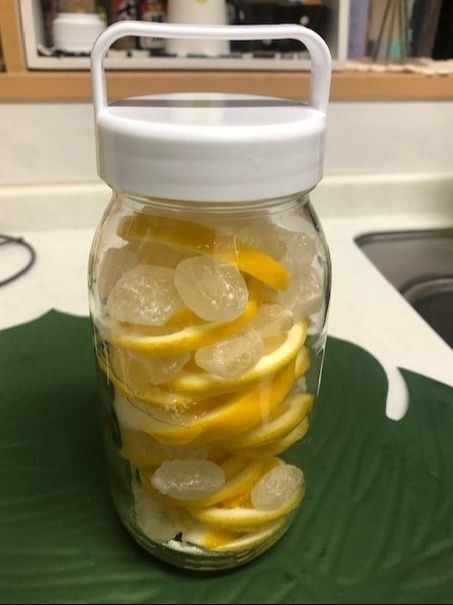 レモンと同じ重量の氷砂糖を用意します。氷砂糖 → レモン → 氷砂糖…と交互に重ねて入れます。最後は氷砂糖が一番上になるようにします。蓋をして冷蔵庫で保存します。
