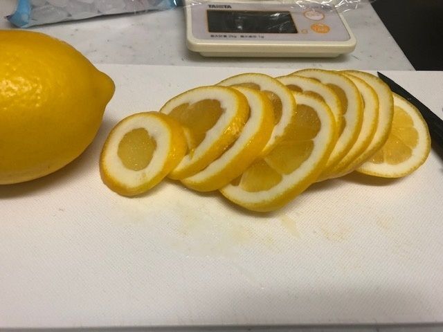レモンをよく洗い、水気を拭き取ります。ヘタを切り落とし、輪切りにします。種や白いワタの部分も丸ごと使います。