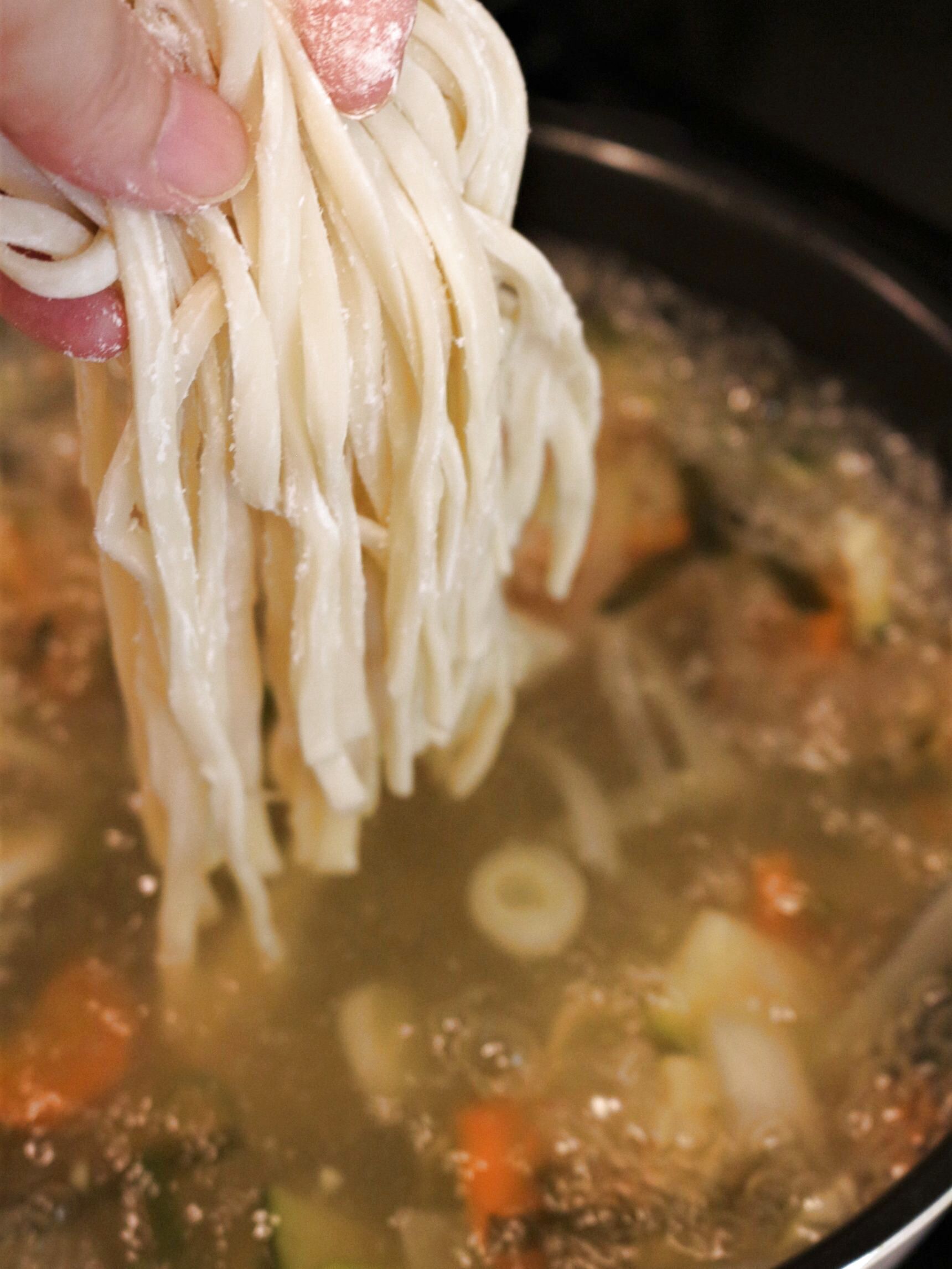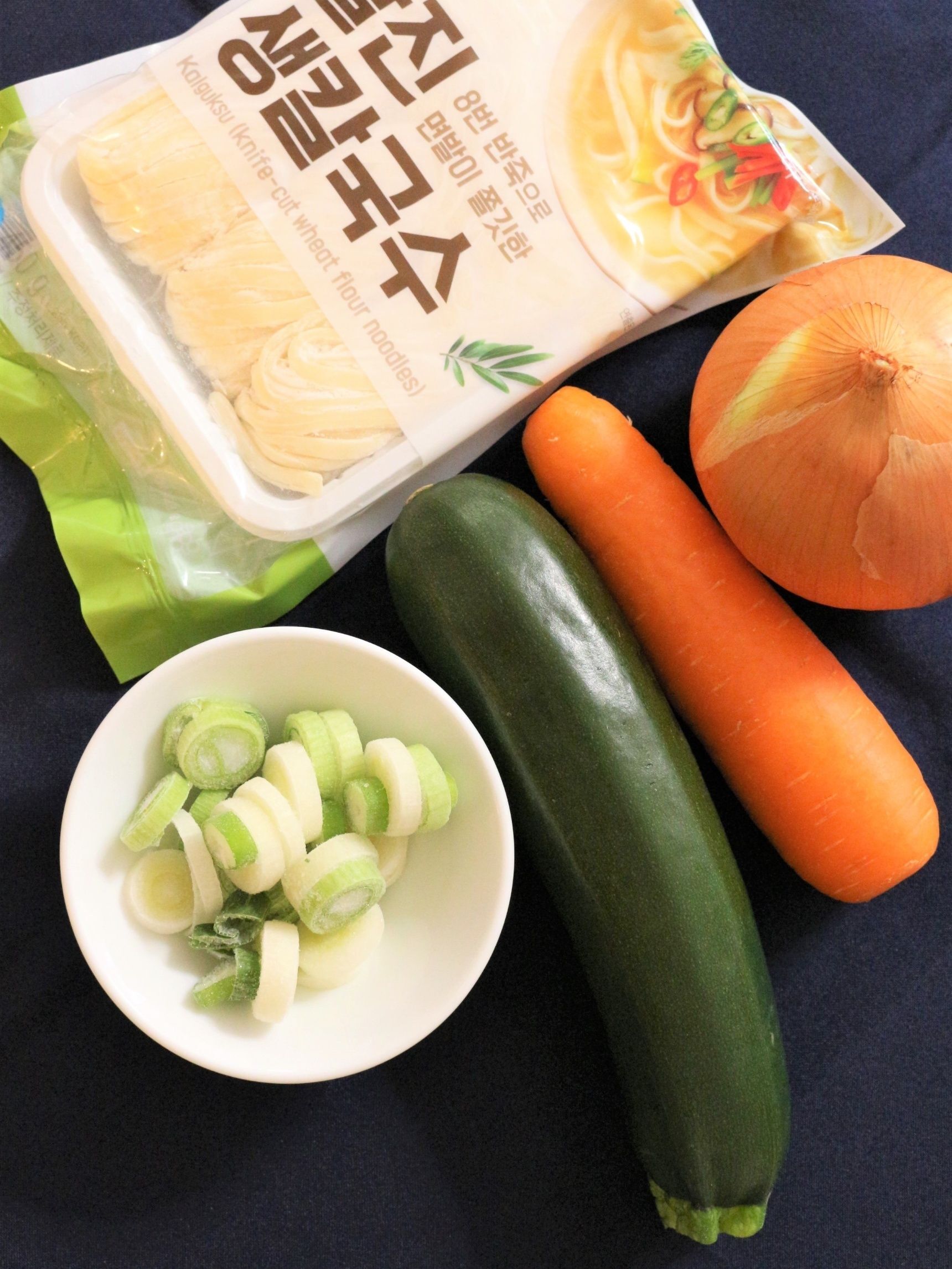 ②鍋に水と昆布、顆粒ダシを入れ沸騰させて、カルグッスと①、ニンニクを入れ7~8分煮込む。昆布は取り出して刻んでから再度加える。