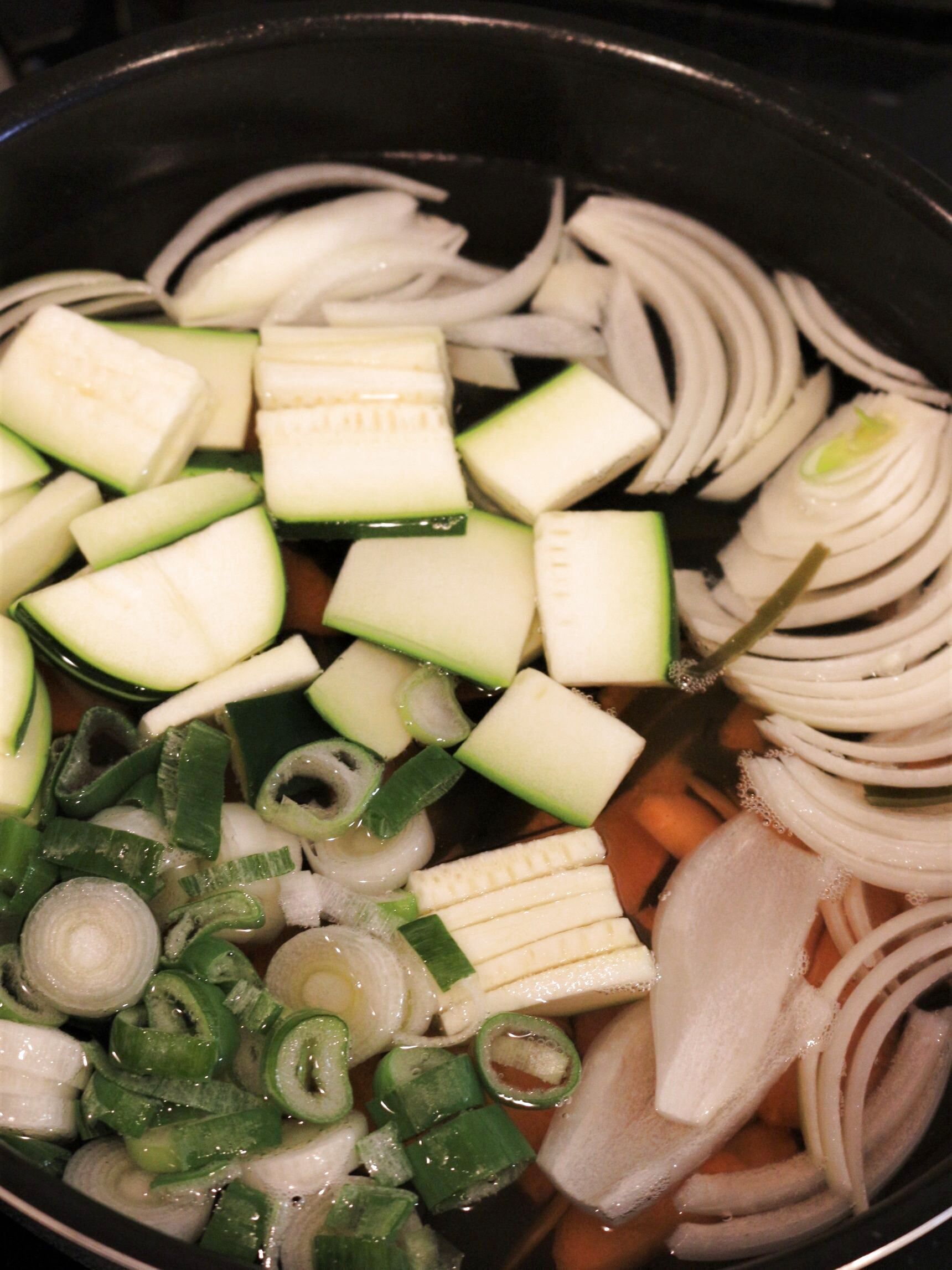 ①ズッキーニ、にんじん、玉ねぎは薄切りに長ねぎは小口切りに切る。