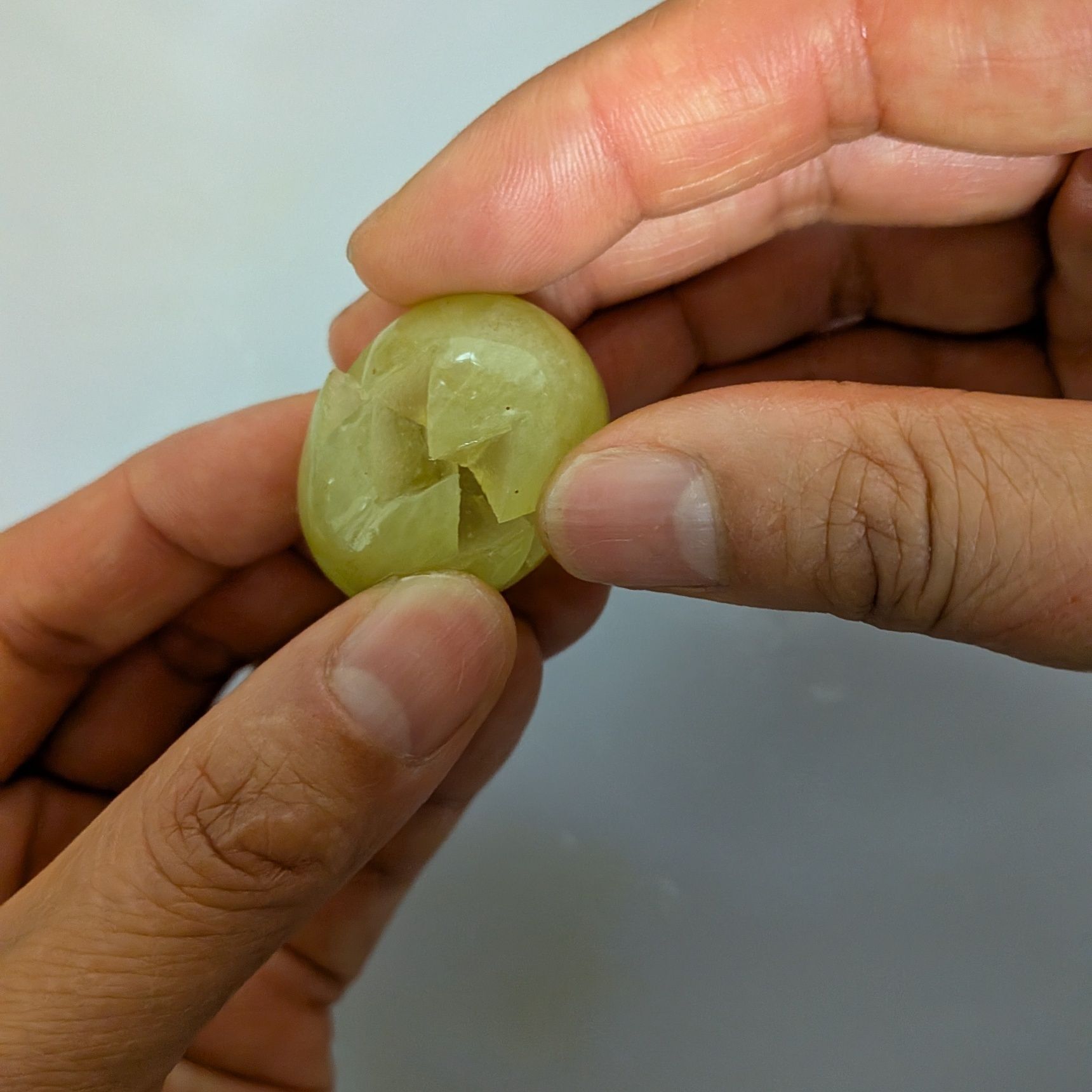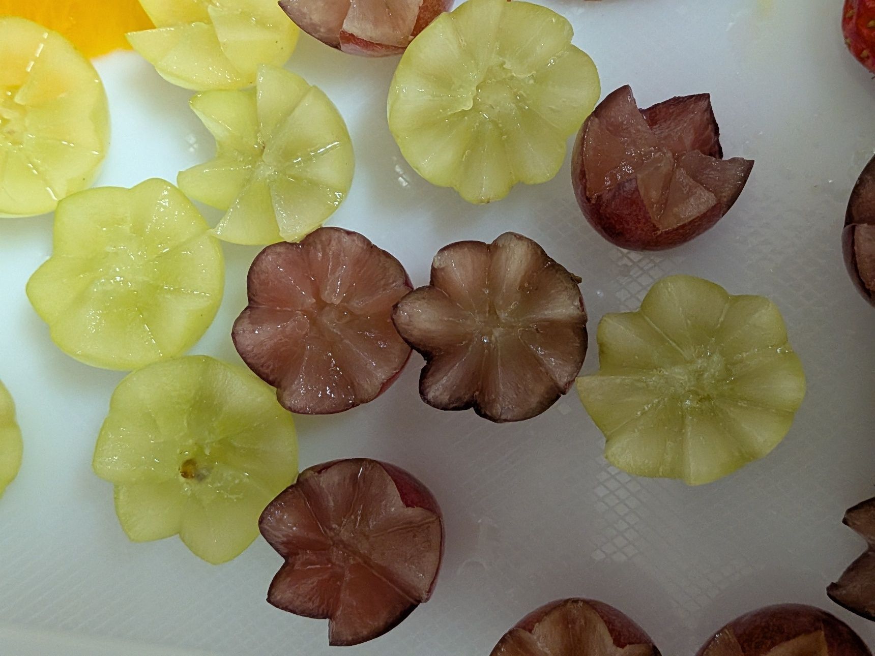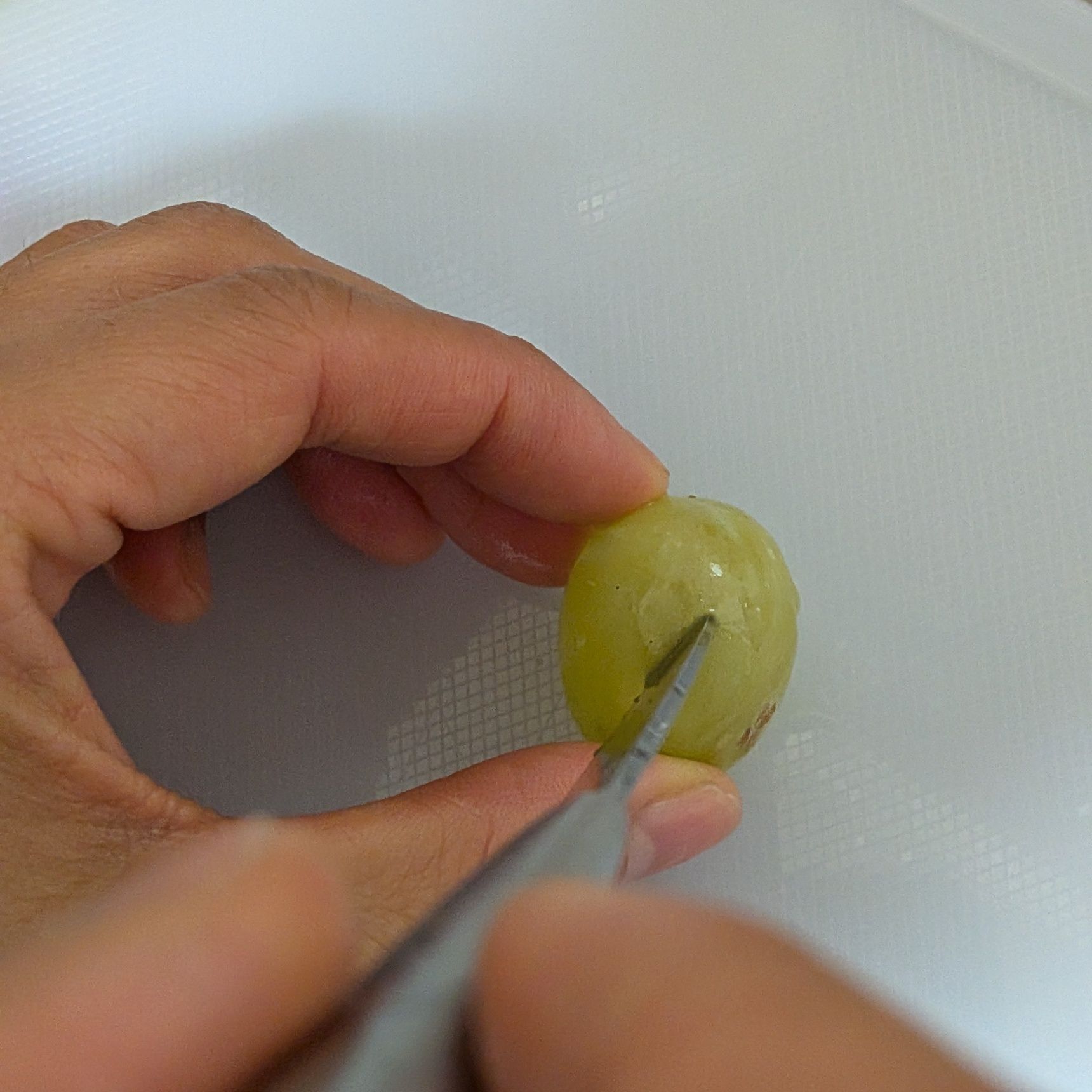 ぶどうの真ん中に包丁を45℃位の角度で刺す。