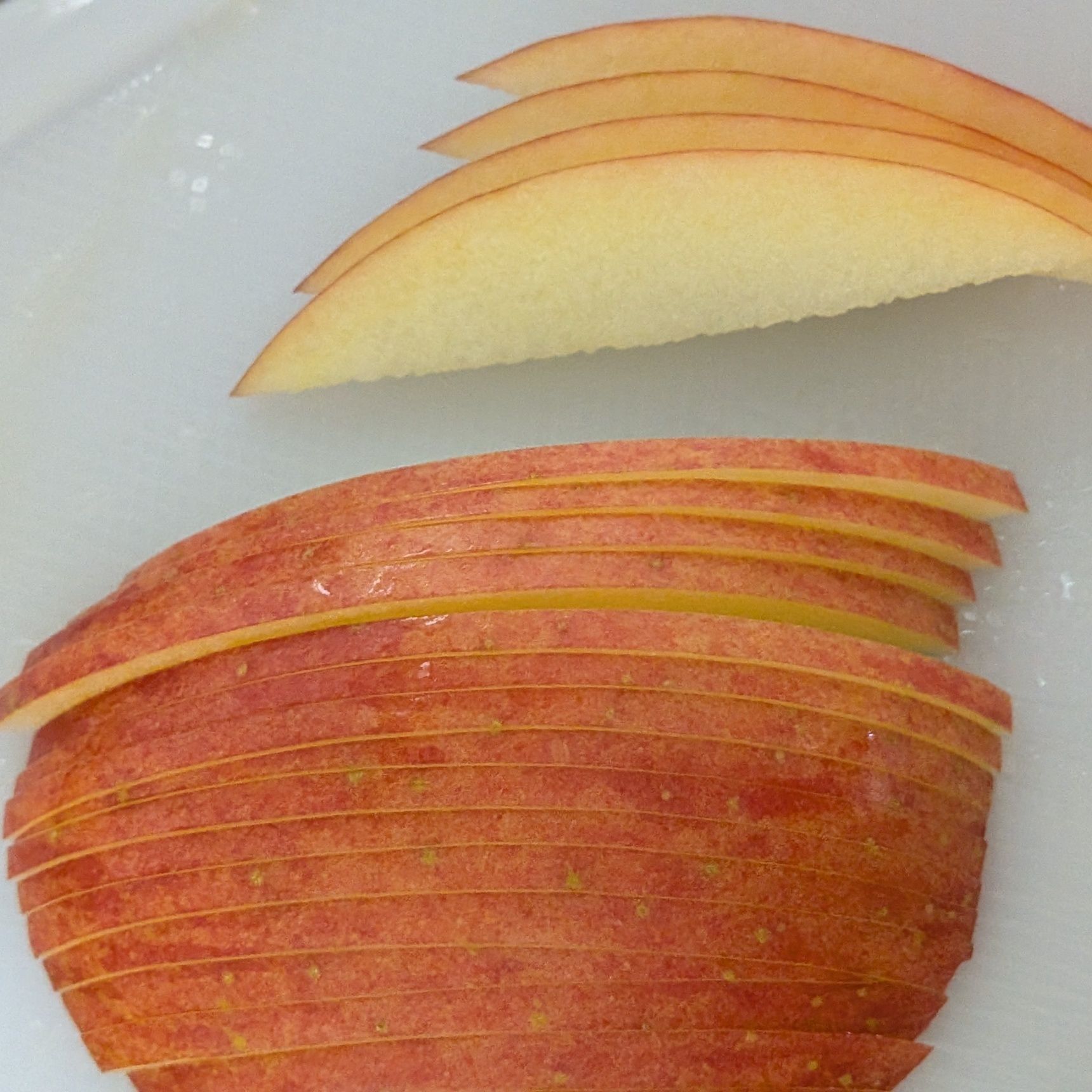 皮をむいたあと、半分に切る。端から薄くスライスする。