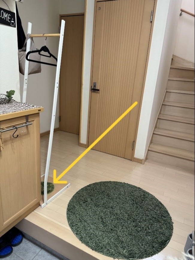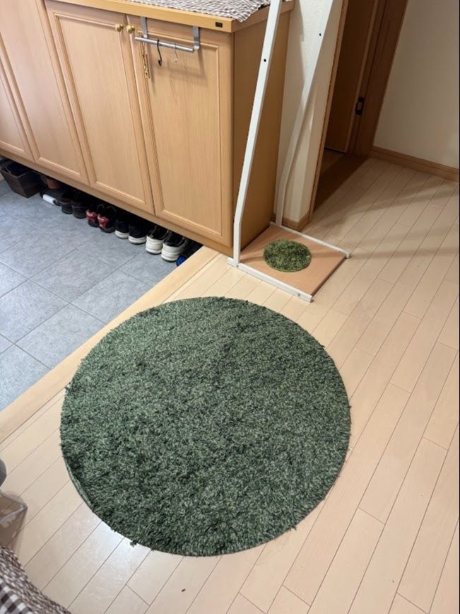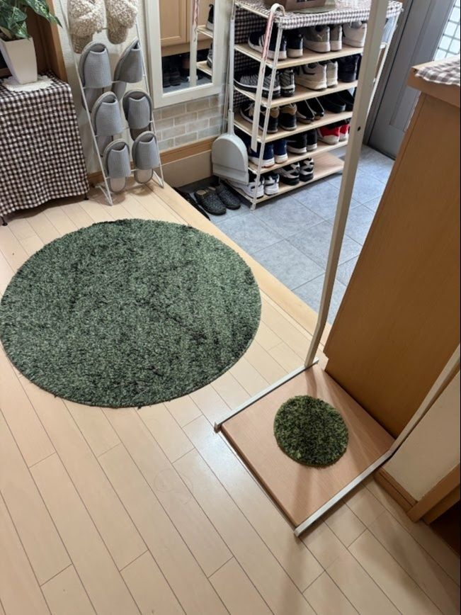 以前、ニトリで購入した玄関マットと同じ色、質感でそっくりなので、「大」「小」と並べて玄関のコートハンガーの底部分に敷きました。