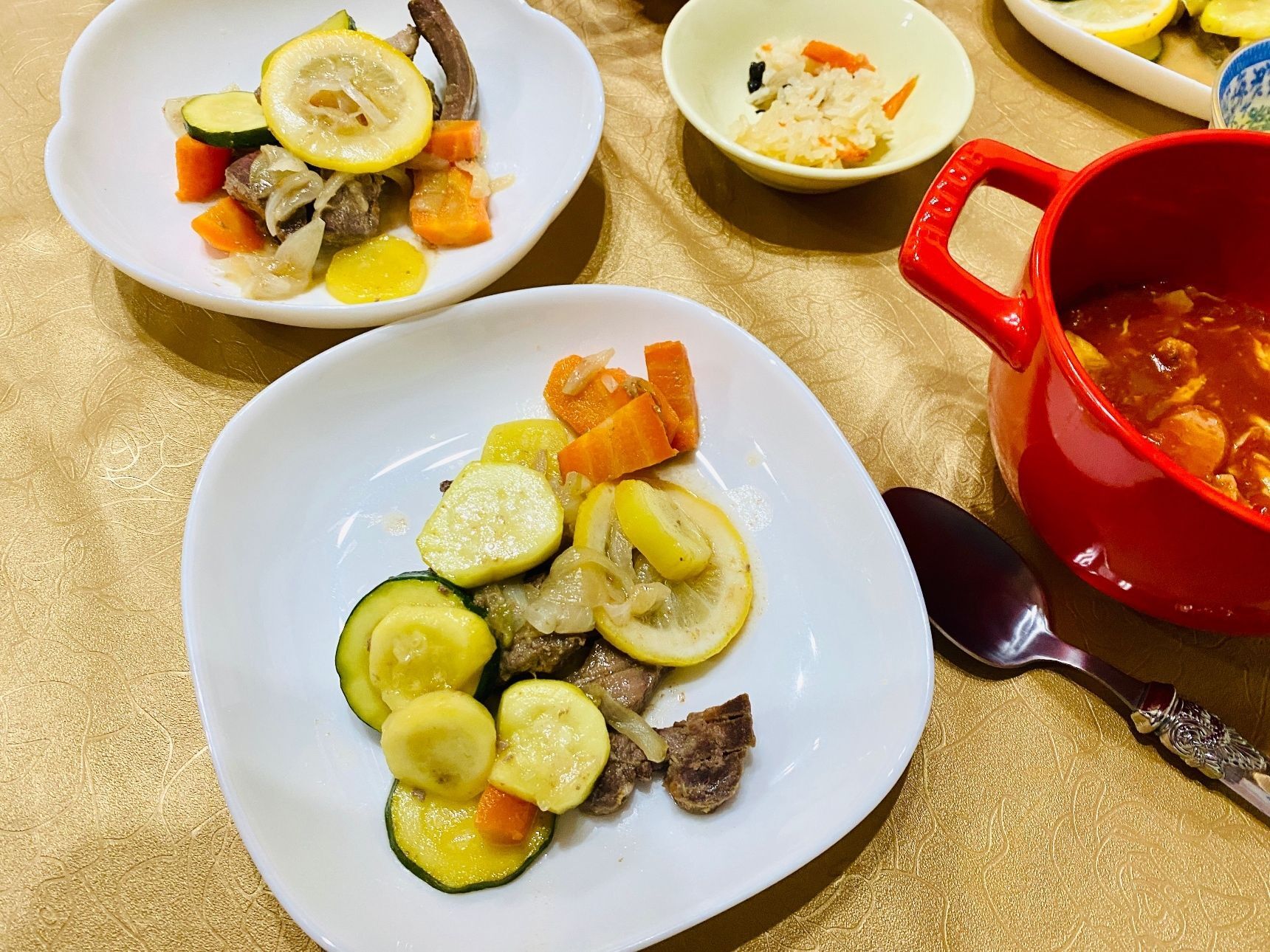 ①にんじんはスライス、ズッキーニは輪切り、玉ねぎは縦半分に切ってくし形切りにします。牛たんは食べやすい一口大に切ります。
