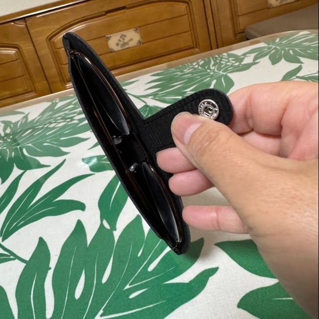 老眼鏡を入れてもこんなに薄いので嵩張らずにスッキリです。カバンに入れて持ち歩いていますが、老眼鏡が壊れたり傷ついたりすることもありません。