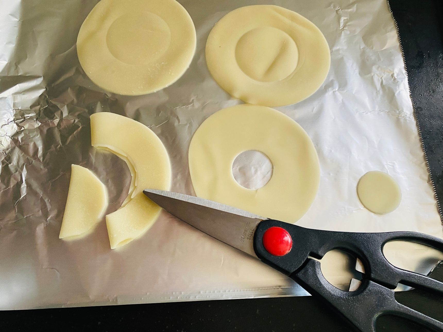 ②あとをつけたところを、ハサミでカットします。半分に軽くたたんでカットするときれいにできますよ。