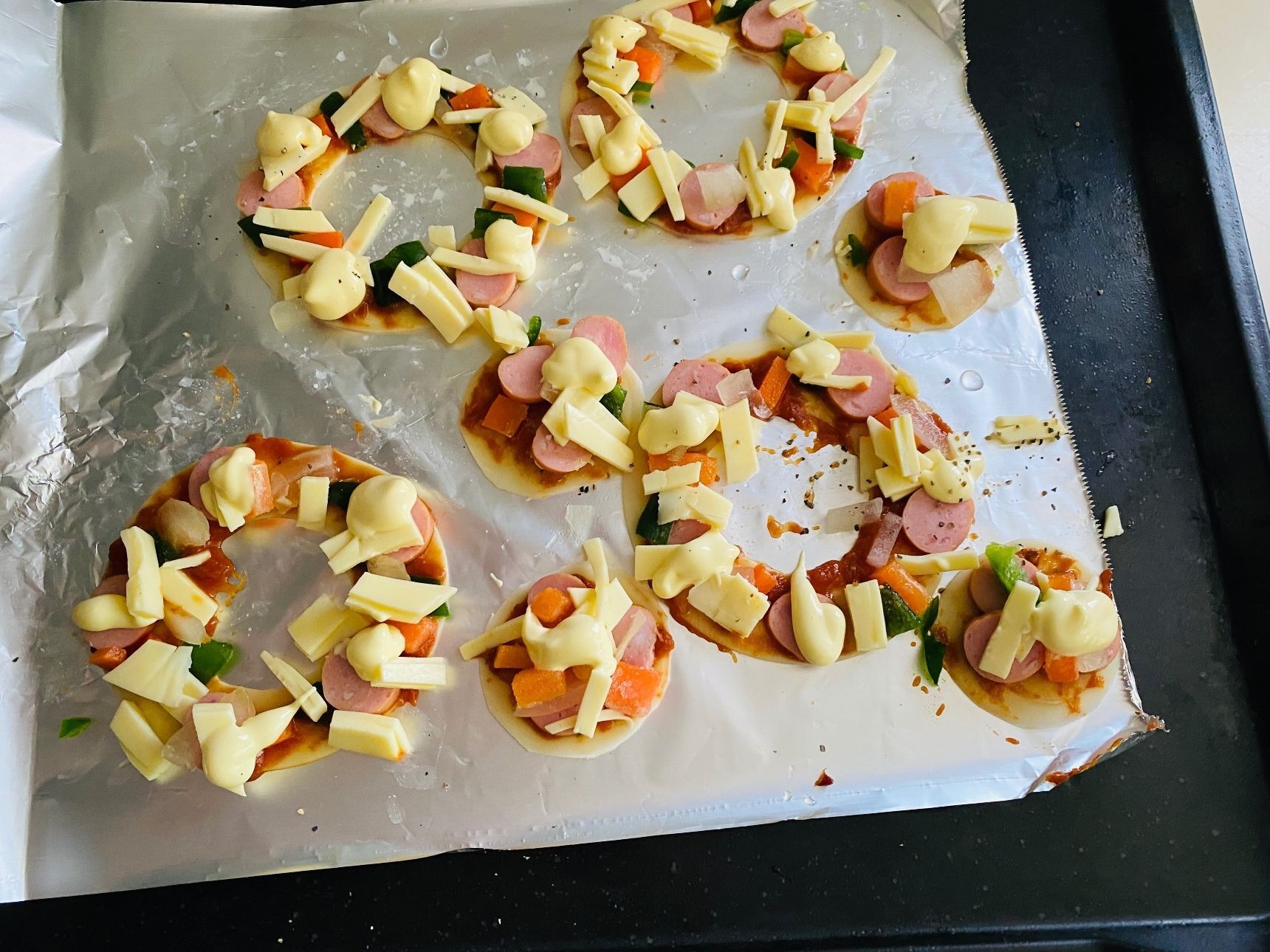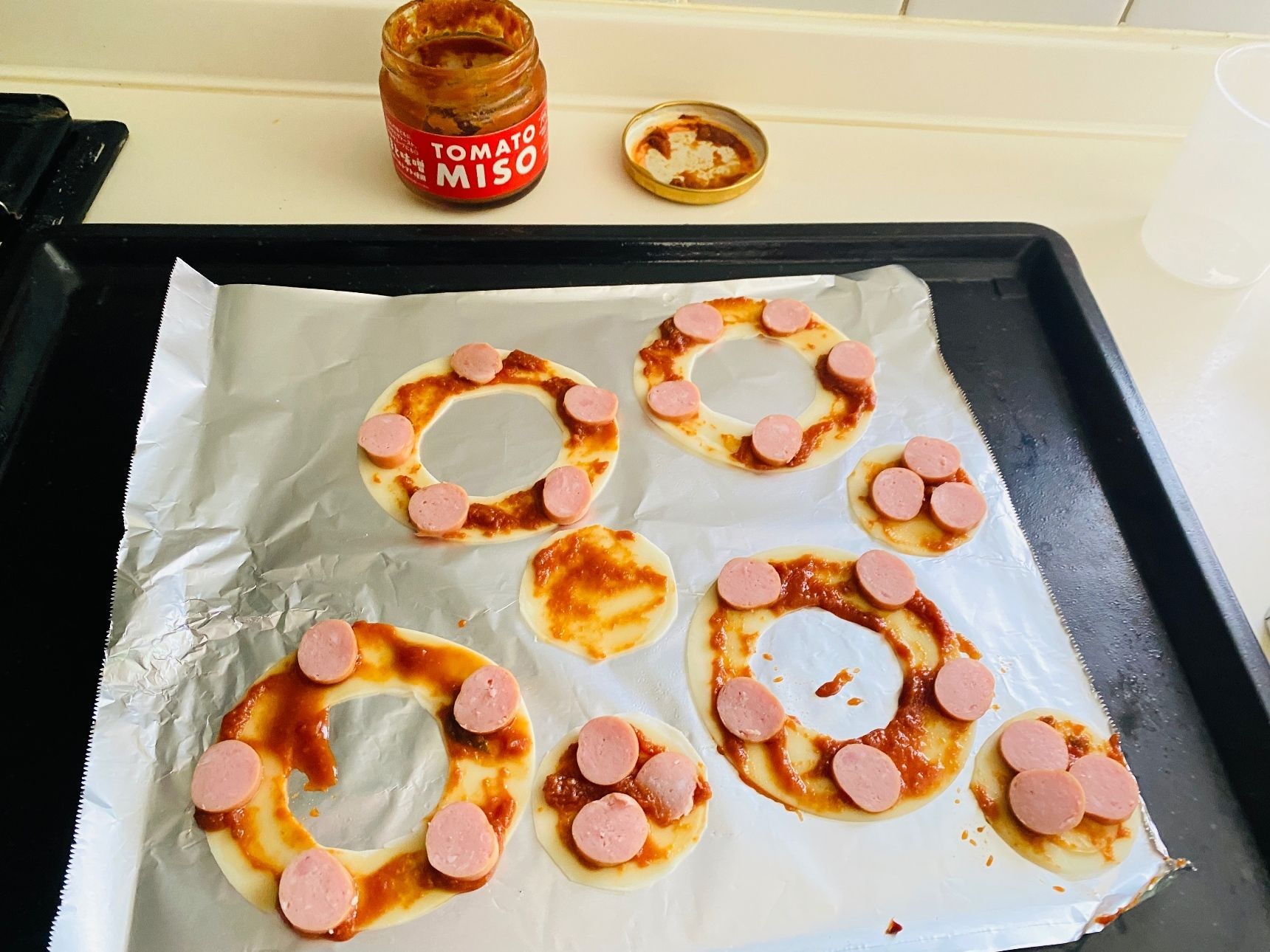 ③②のリース型の餃子の皮に、トマト味噌を塗ります(トマトケチャップやピザソースでもOKですよ)。輪切りにしたウインナーを飾ります。