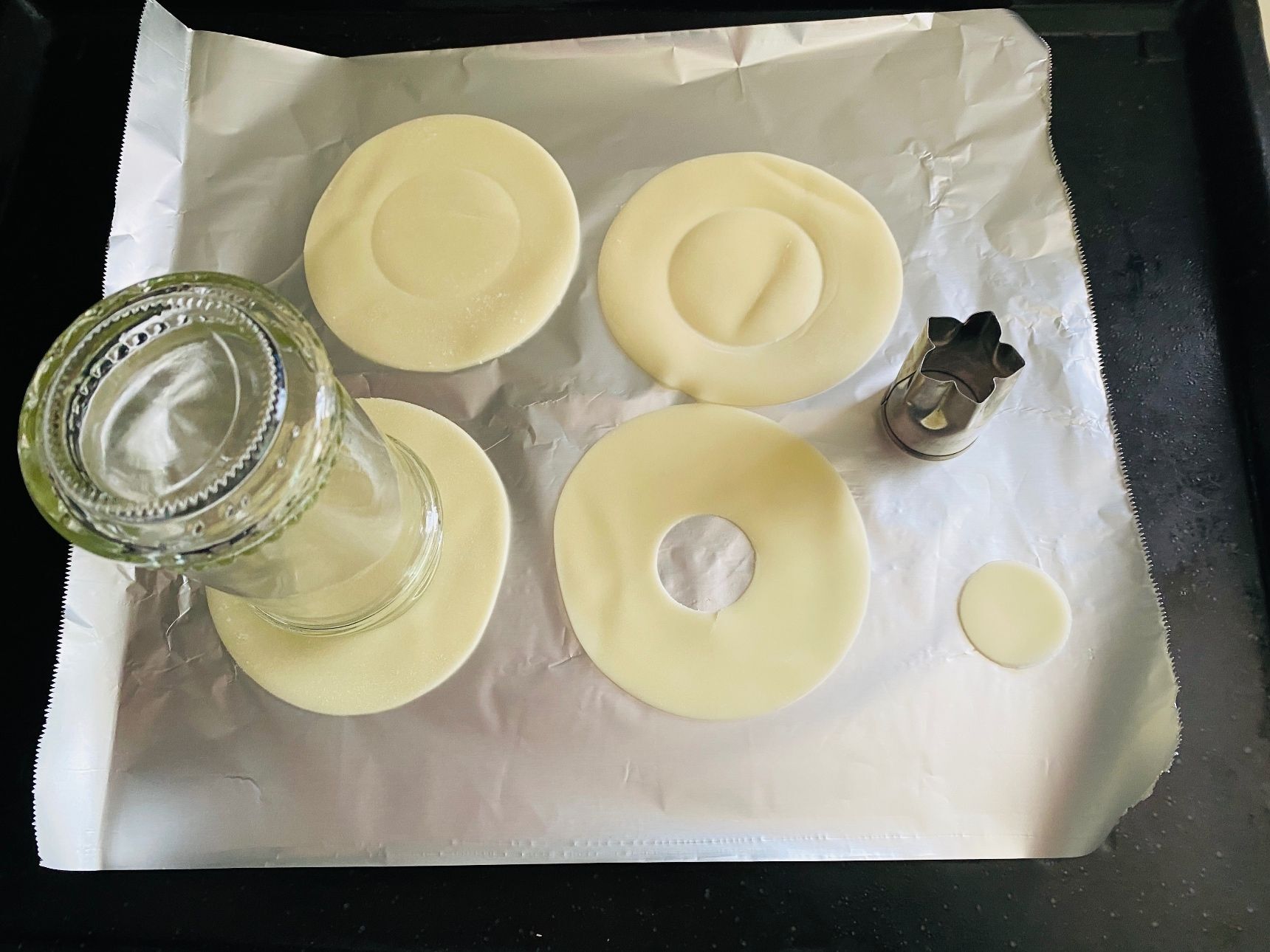 ①餃子の皮に、空き瓶の口で軽くあとをつけます。