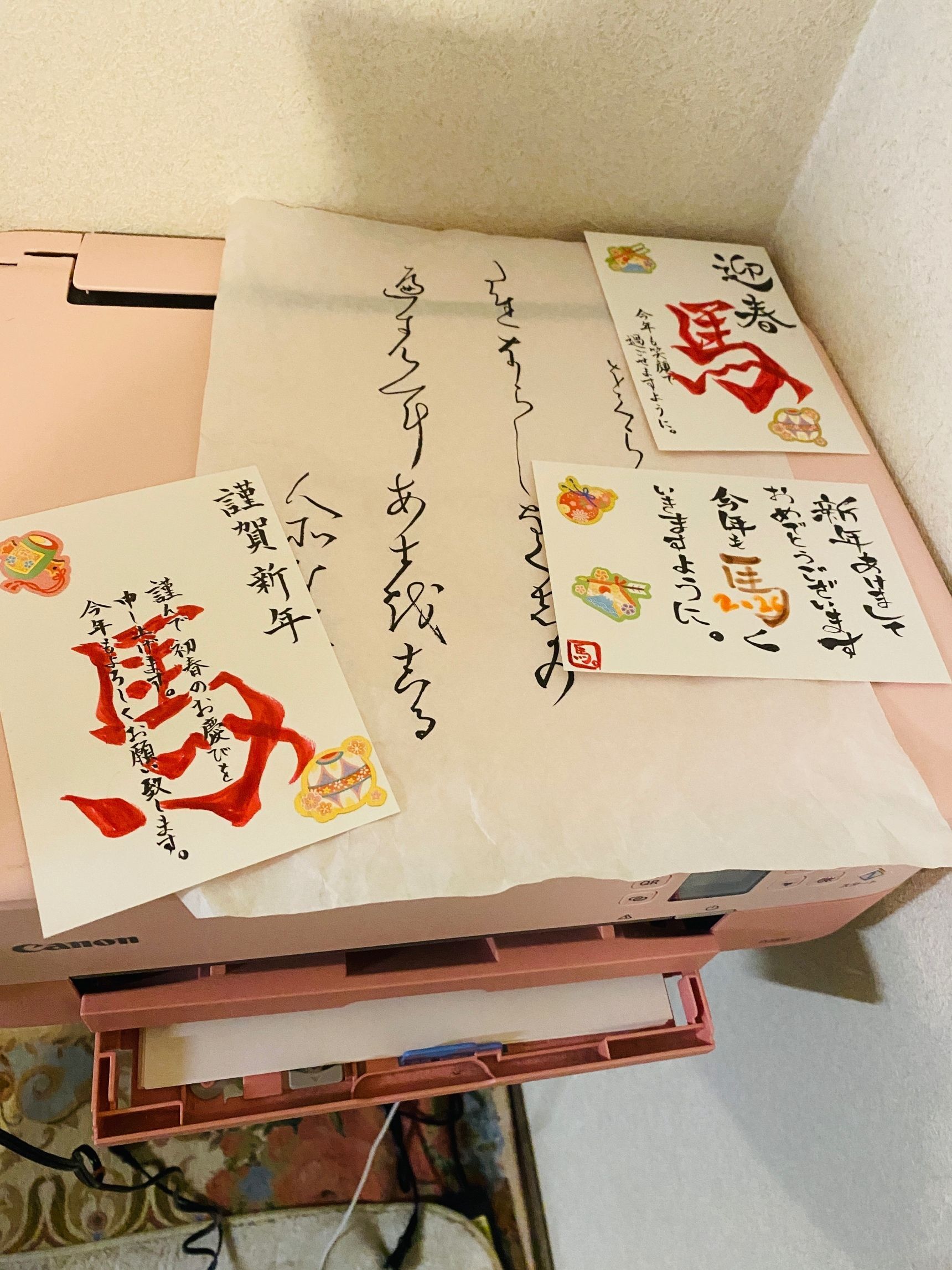 年賀状は印刷をお願いするか、スマホで済ませる方も多いと思います。わが家は以前は写真付きの年賀状でしたが、節約も兼ねて手書きです。家のプリンターのインク代金もかかるので、手書きで心を込めて、100均で買った年賀シールも貼ってお正月らしく仕上げていますよ。まだ、喜んでくれる方もいらっしゃるので、うれしくなります。