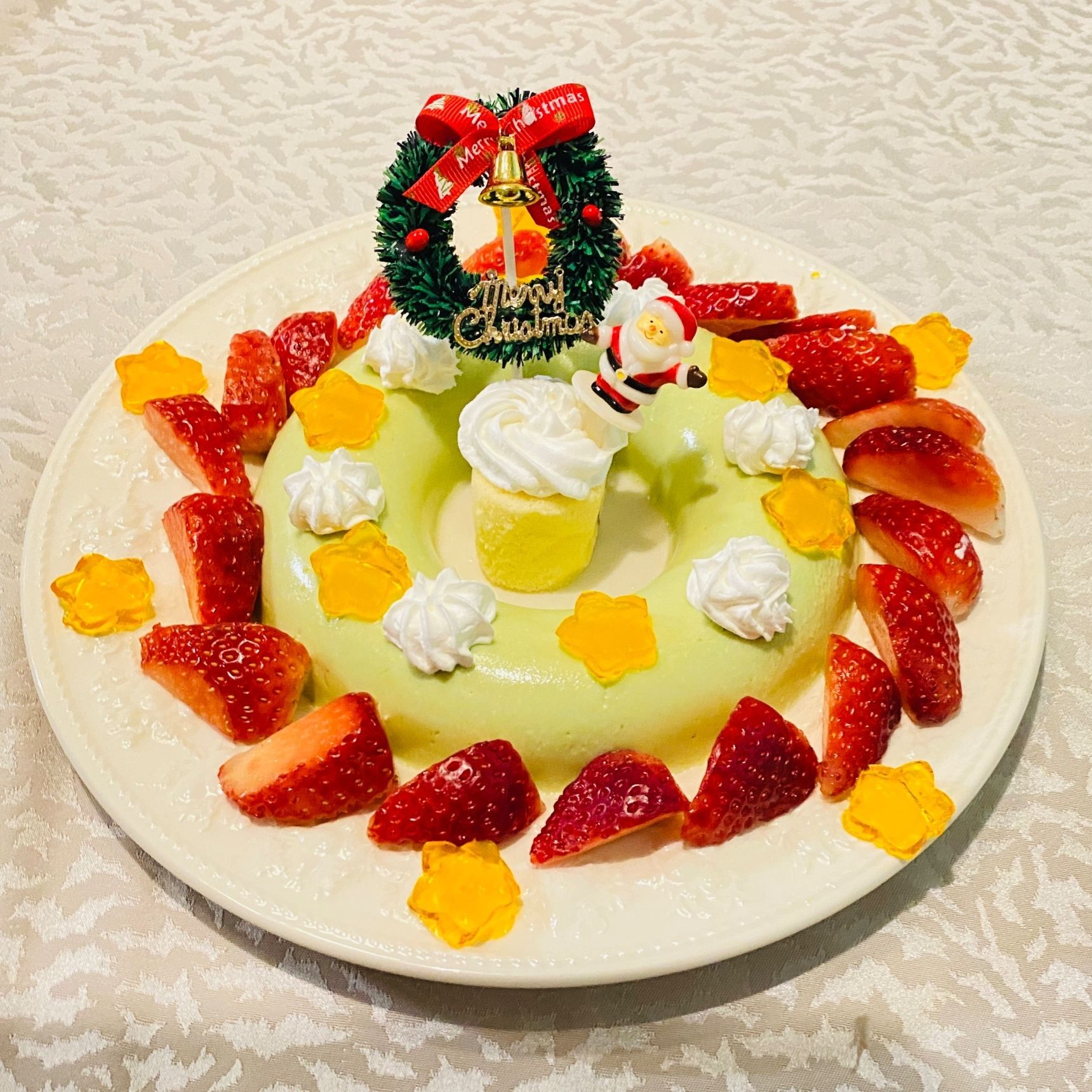 真ん中にミニロールケーキを飾り、ホイップクリームを塗り、クリスマスリースやサンタクロースを飾りました。