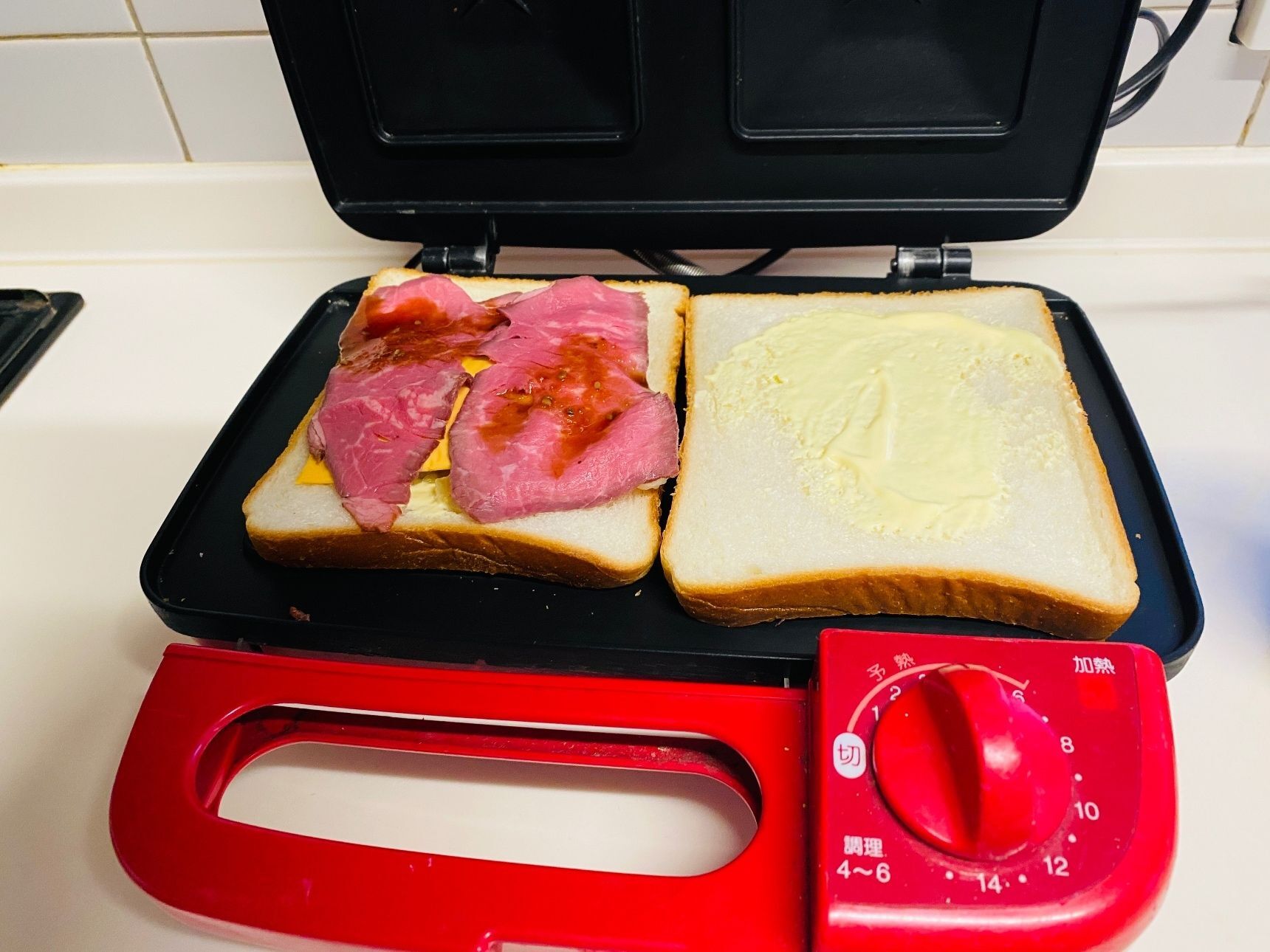「超熟」パンにローストビーフを挟んでホットサンドにして栄養補給!