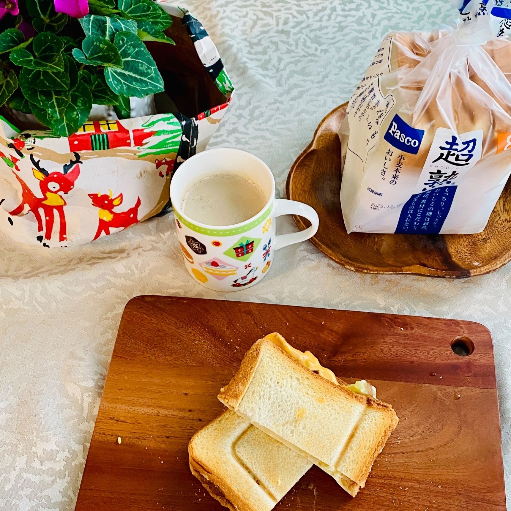 美味しい「超熟」ホットサンドにカフェオーレ!雪かきにも気合いが入りますよ。