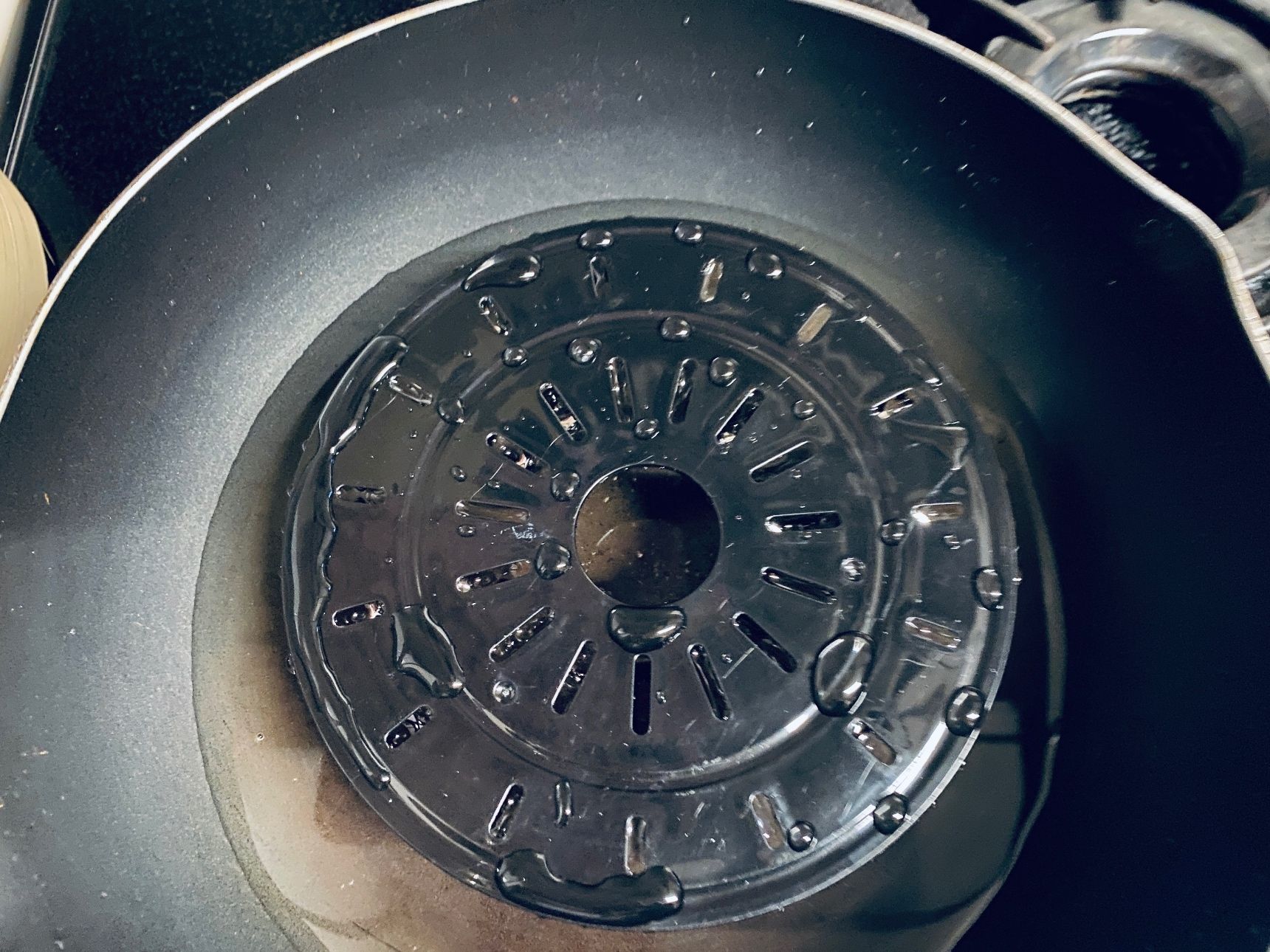 ②フライパンや鍋などにせいろ台を置いて、お湯を入れて①をのせます。