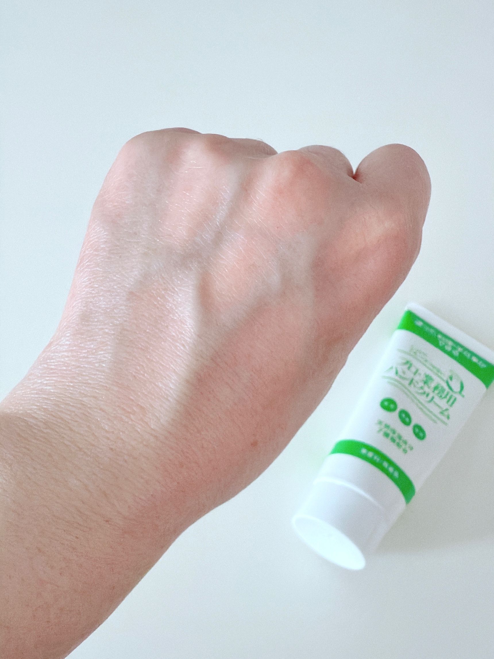 ハンドクリームを手に乗せると、やや硬めのテクスチャー。まったく垂れてくることはなく、手を傾けても動きません。