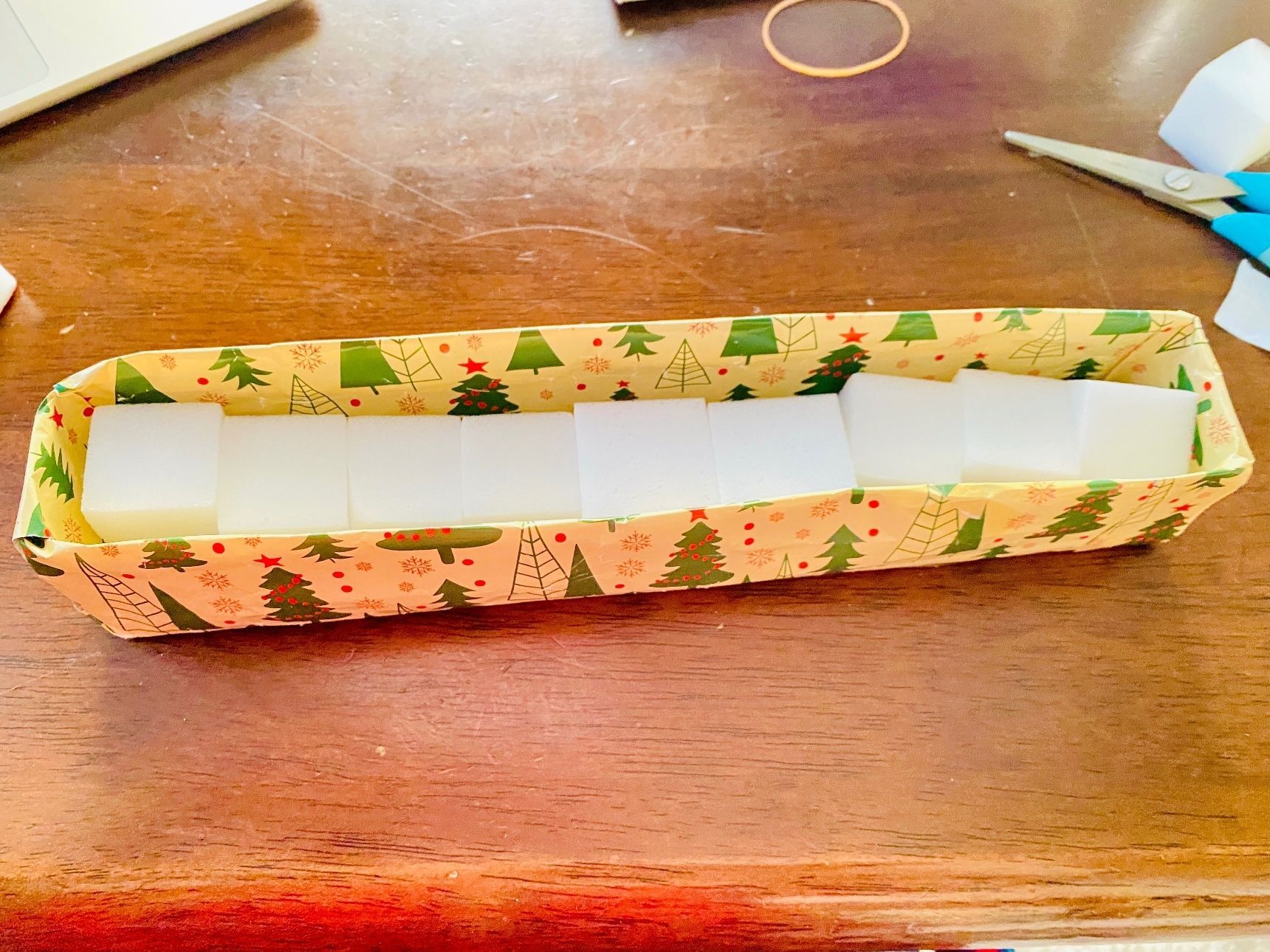 中にクリスマス飾りを刺して飾りたいので、使い捨てスポンジをグルーガンで貼りつけます。