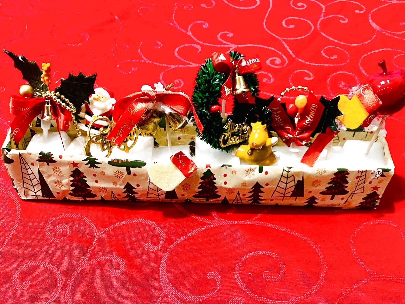 以前クリスマスケーキについていたもの、フェルトで作ったクリスマスブーツや、100均で買ったものなどを刺します。刺せないものは、爪楊枝にグルーガンをつけて刺してから飾りました。