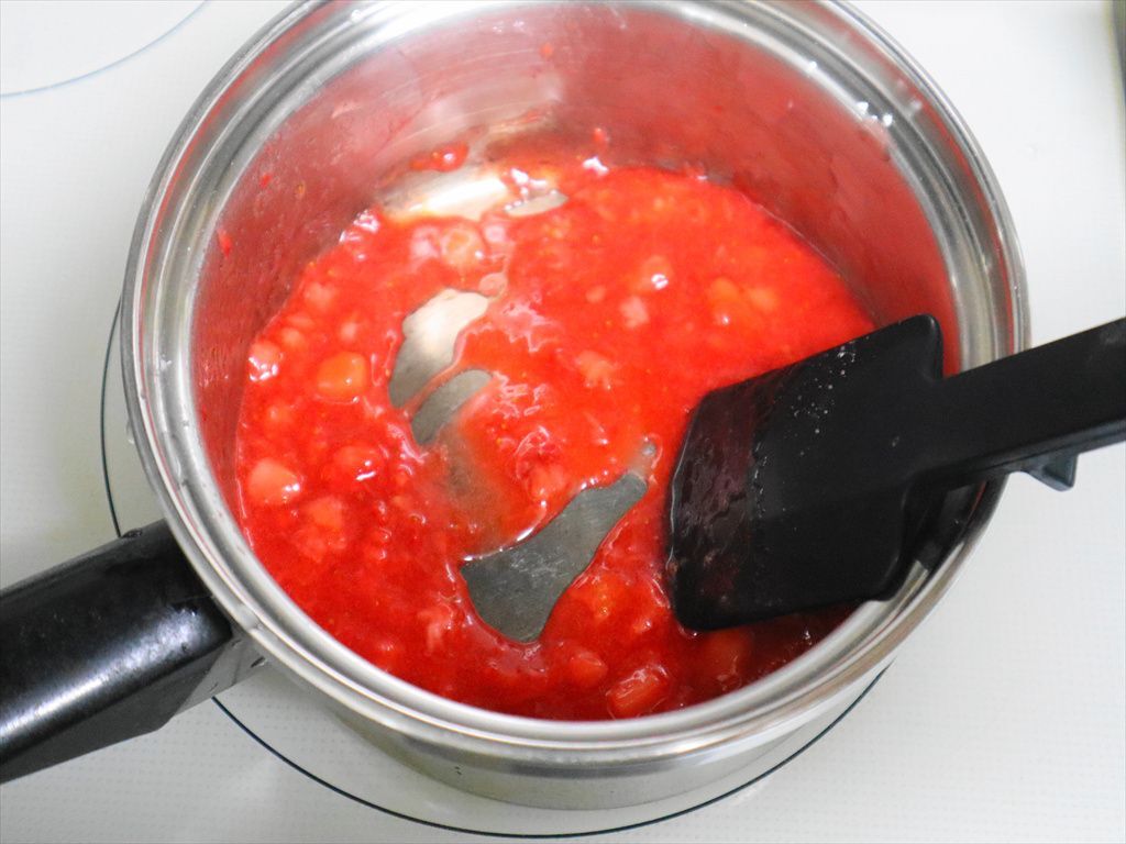 鍋に冷凍イチゴと砂糖を入れてそのまま解凍すれば、崩れやすい状態にもうなっちゃうので時短に。