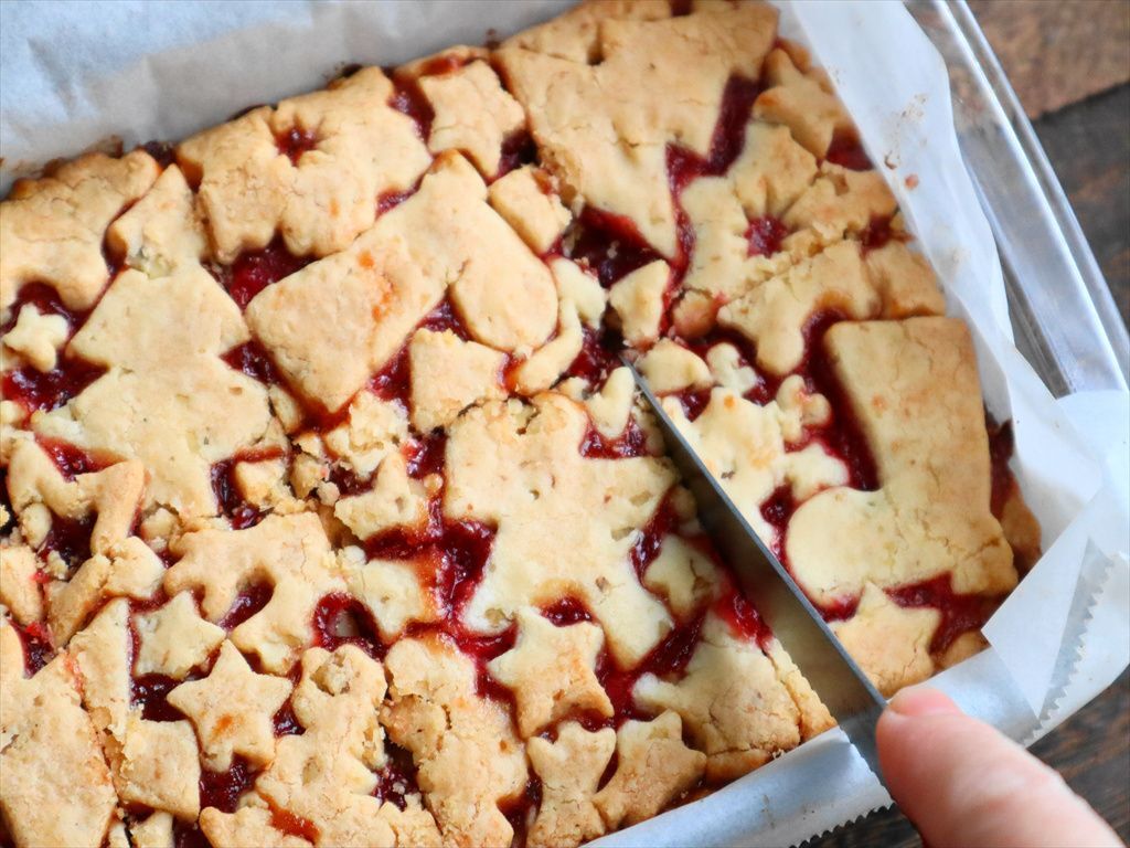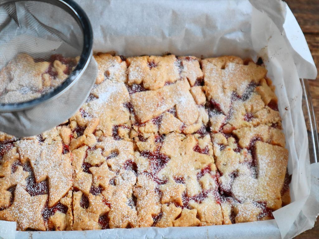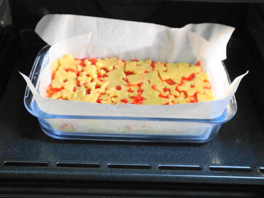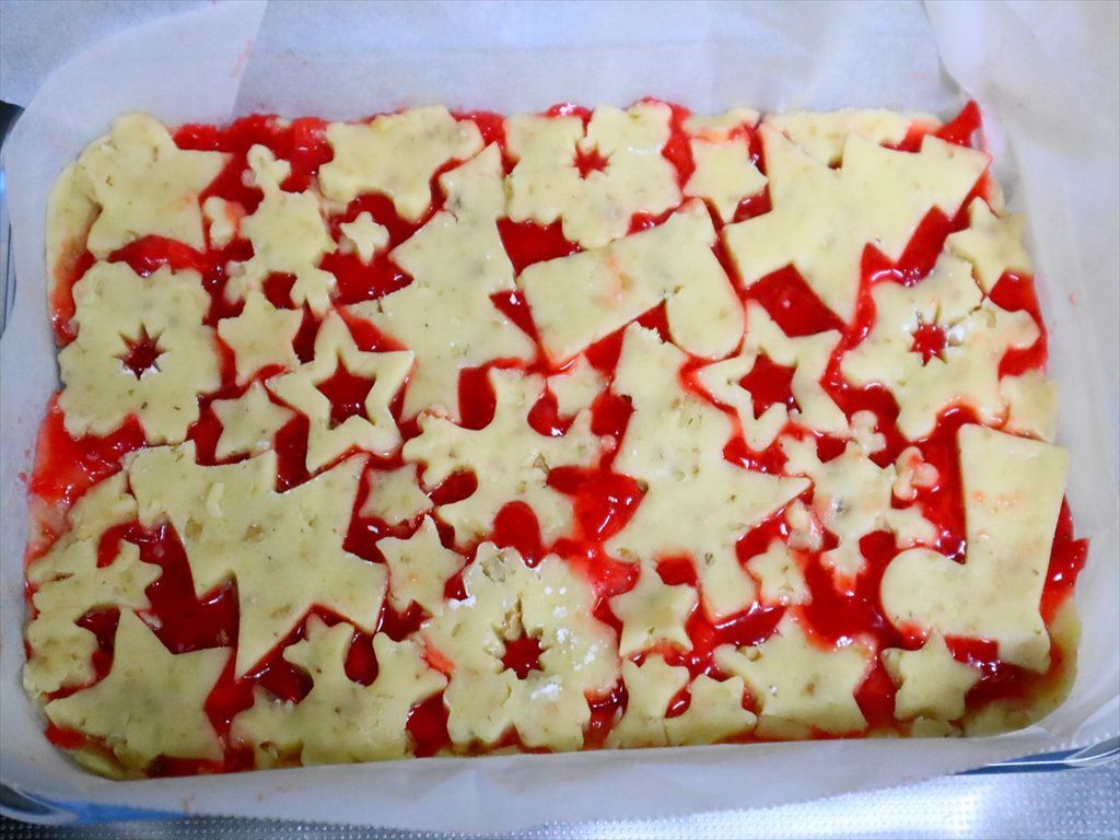 残りの生地を伸ばし、抜き型で抜いて苺フィリングの上に敷き詰めていきます。胡桃の粒々があって多少抜きにくいです。凹凸の多い形だとキレイに抜けない場合がありますが、抜き型に薄力粉をはたいておくと外れやすいのでやってみて。