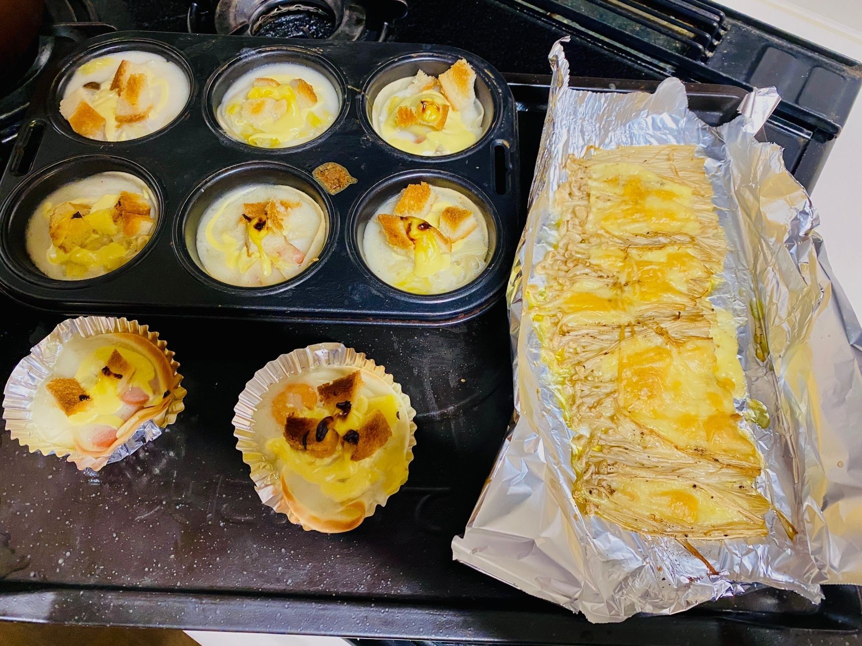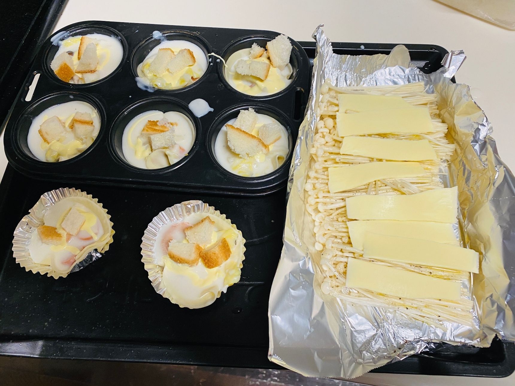 天板がだいぶあいてもったいないので、昨日の夜に余ったシチューに食パンを切って入れて、パルメザンチーズをかけて、マヨネーズを絞ってのせたものと一緒にオーブンで焼きました。